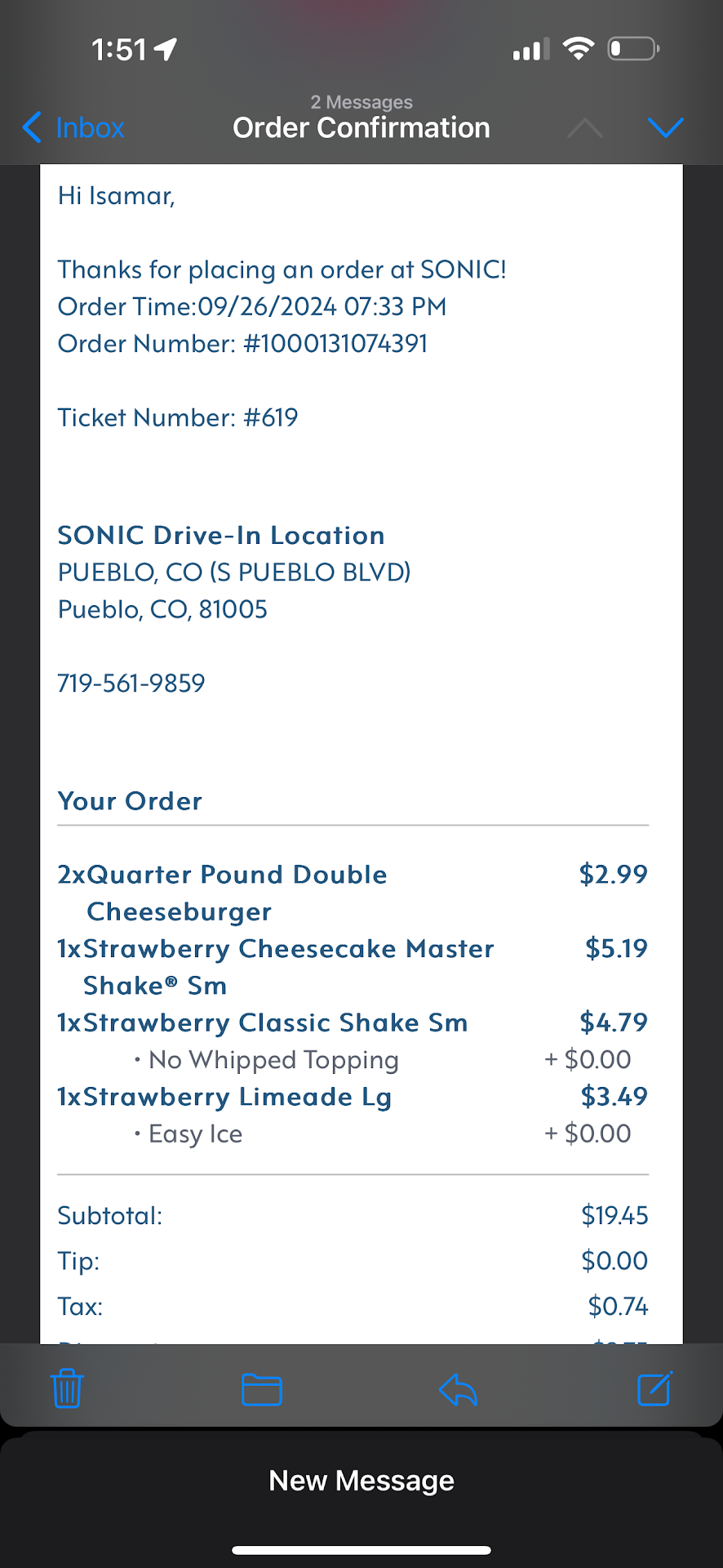 Read moreI am so upset about my experience, i went for a late dinner just around 11 and everything was fine the car hop was friendly and everything seemed great. When I got home I noticed that a chili cheese coney was missing from my order so I called them up thinking that I could drive back and pick it up, well the assistant manager ( I have no idea how this horrific woman earned this title) missy was completely unprofessional. She told me that they were closed which was no big deal, so then I asked if I could just go back in the morning to get a refund for the part that was missing and she said I could get a chili coney in the morning.. i expressed to her that i was not nterested in eating that at 7am if i could get something of similar price off the breakfast menu. She than said no you can have the chili dog. I was a little upset so I asked if I could just get my money back and she then said " sir if we were just giving out money we'd go out of business you can come in tomorrow to pick up your coney" my meal was $20 the sandwhich we did receive was disgusting and when I brought that to her attention she said well we were almost closed. I'm not really sure how these things work but I'm pretty certain that when a restaurant has a posted closing time that they assure quality food and service up until that time... maybe they should say "sonic- great food until and two hours before we close when our staff gets lazy and our...