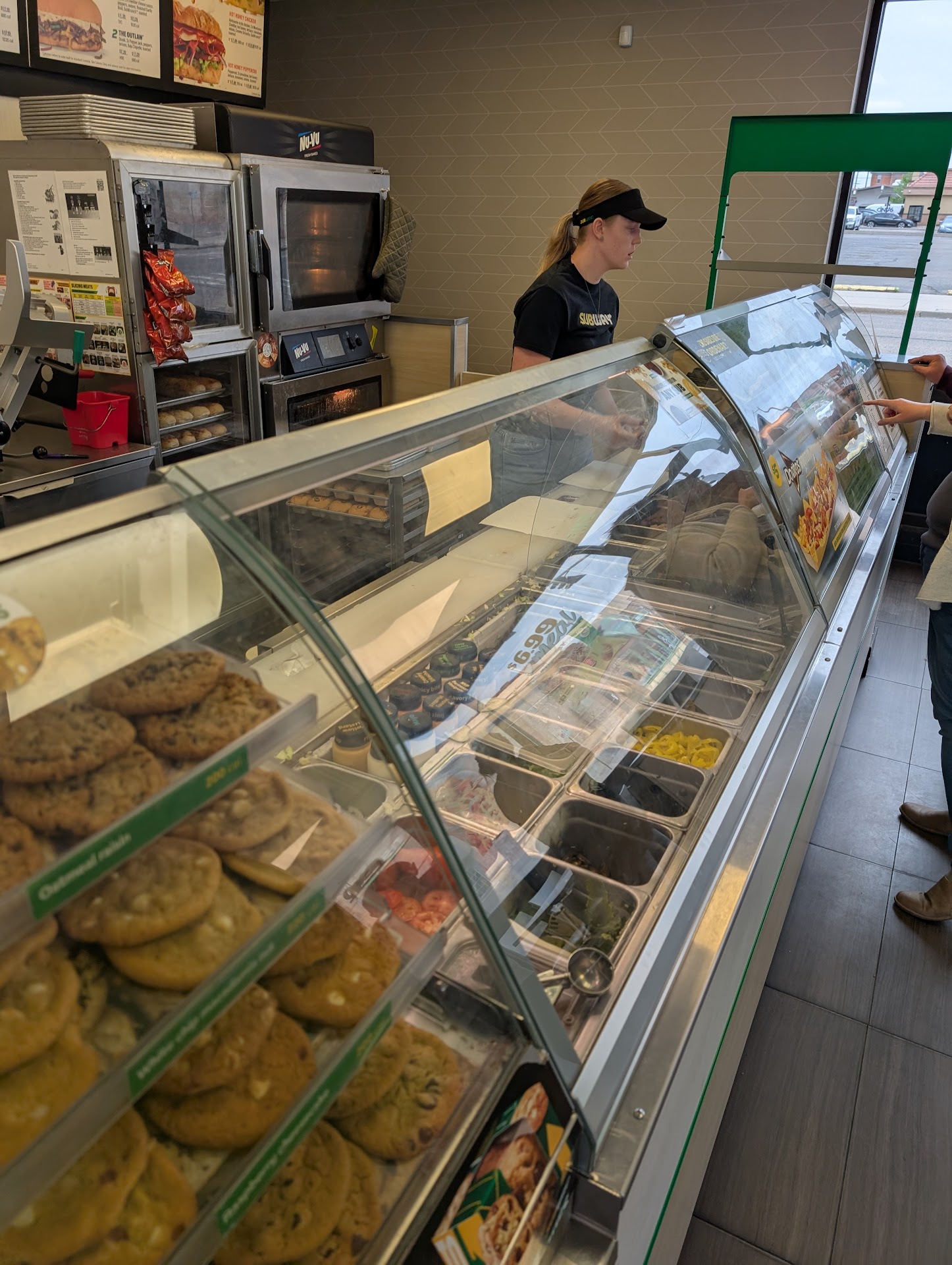 Read moreWent in at 9 an hour before close and the woman with dreads was putting everything away teas were empty ect. She made us wait for her to set up the line to take our order that was fine i get it some places are really slow so she was closing. I ordered an Italian BMT but they were out of salami.... I asked her to just put somthing else in it and she refused cause of "inventory". Ive worked in the service industry for 10 years thats the most rediculious thing ive ever been told. If you as a business are not carrying a product you should or just dont want to get more because its late you should accommodate the guest not make excuses about how 4 slices of ham will throw off your inventory !!