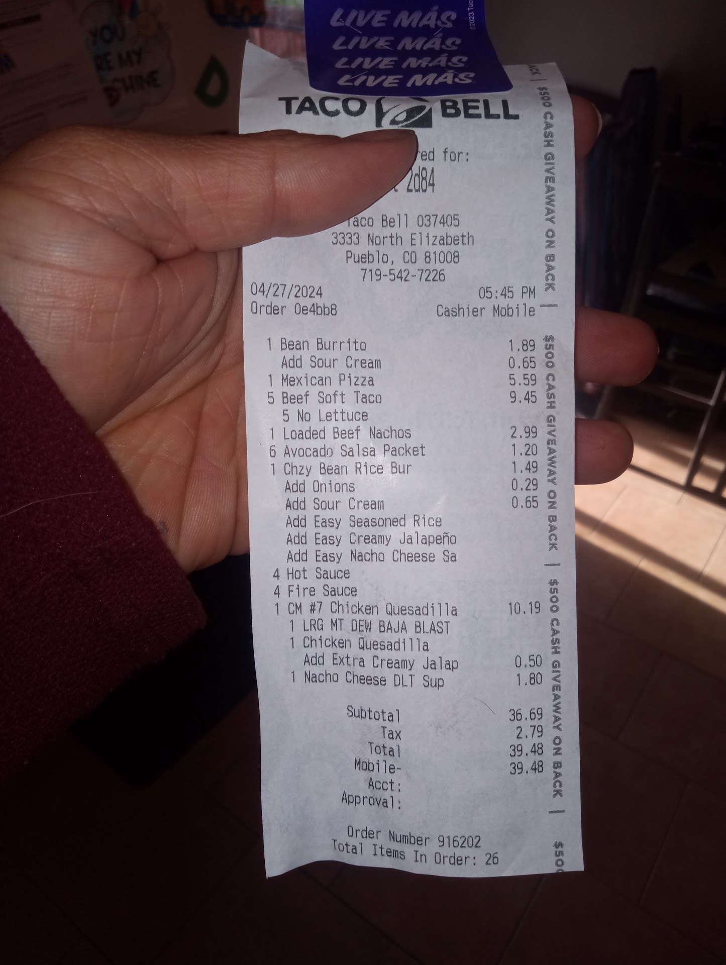 😚 I like Taco bill it's convenient have food is served hot I get what I want is Priced Right. the drinks are expensive. I think when you pay $2 for a small Coke... a bit much. but you know they have the best drinks in town. well I like soda pop and I like your little skinny straw I think that helps to make soda better. I usually get a soft shell chalupa without lettuce and it served about half full which for the price of $3 and I think it was they could Fill it to the top but other than that. it's a magnificent Place. its always clean I go to the one on 8th and Santa Fe because it's close to where I live in Pueblo Colorado. the Ladies. Take pride in their appearance their hair always looks pretty their nails are always clean they have cute clothes on now you ask for the survey their aprons real clean that's a big plus now the guys could be a royal cleaner they could put on a clean apron but most of them at their their hair looks good and it's clean their nails are clean Hands Clean their shoes are clean usually their tennis shoes but they're clearly they don't have food was flopped on them are there Panther or pressed these are things that help sell for people like myself they come in to Taco Bell I love Taco Bell to me I think it's one of the well I think it's the best place in Pebble next to McDonalds I love McDonald's first then Taco Bell but that's my preference I love McDonald's double cheeseburger with extra mustard and one pickle in the center and no salt like Taco Bell still has the best soda pop I think here in Fayetteville it just is so good and I like the little skinny straw I think that helps make it better okay you got all your high fives that's all you're going to get for now love you have a beautiful day thanks for the survey. I MIGHT ADD... the bathrooms are always clean the floors are clean the windows are always shiny. It's great for your employees take pride in their company that they work for. but keep it at . hot food, friendliness, supplies are well-stocked is cool I like it . EMPLOYEES they take pride in their place where they work. they give you time to think " what you want. what you need. there is harmony among the co-workers. that's another Plus. Overall I would rate them as 4.5 out of survey of Five Points today is Wednesday November 27th 2019 time 1:37p.m. Pueblo Colorado time. good luck for more success I love Taco...
