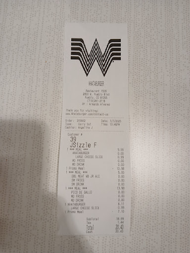Read moreSo I Came In Around 10pm To an Otherwise Empty Establishment Maybe 3 Other Patrons A Very Irate Man That Claimed To Have Been Waiting Over 30 Minutes, The Clearly Frustrated, and Upset Front Counter Girl Acknowledged His Claim and Was Angerly Trying Helplessly To Keep Her Composure At Being Over Worked and Possibly Understaffed, She Mentioned To Me That They Did Not Have My Regular Favorite, A Patty Melt With Green Chile, Which Began The Downward Turn Of Events Also Which Was Confirmed By Management Mind You This Is The Soul Reason For Me To Ever Go To Whattaburger, But I Had An App Coupon For A Free Burger So I Digress However Upon Receiving My Receipt I Noticed Not Only Did They Not Give Me My FREE Burger But in Her Chaos and Frustration She Also Charged Me For an Additional Burger That I Did Not Order lol But I Did Try The New Pico Double Which Was Actually Not Bad It Was Quite Large and The Cheese and Pico Blend Was Not Bad, My Wife Pointed Out However The Extrordinary Similarity Between The Normal Whattaburger and The Sonic Quarter Pounder Basically The Exact Same Burger lol All In All If It Wasnt For The Counter Girls Emotional Breakdown Coupled With The Infighting and Yelling and Crying of The Staff and Management with The Added Over Charge Would Have Been a Good Experience I Will Most Likely Return Perhaps Earlier In The Day Before Emotion and Fatigue Sets In Whattaburger is Normally a Pretty Cool Place To Grab A Tasty Burger PS "BRING BACK THE GREEN CHILE PATTYMELT"...