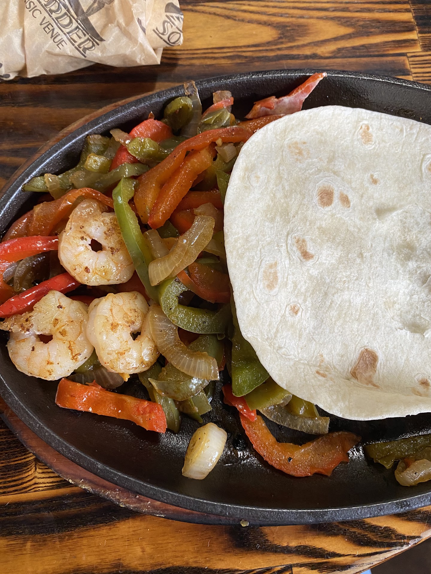 First and foremost, I ordered the sizzling shrimp fajitas, and they did not disappoint. Considering it's a bar, the quality of the food was surprisingly good. The taste was on point, and I was pleasantly surprised by the generous portion size. My plate was loaded with shrimp, onions, peppers, lettuce, tomatoes, sour cream, guacamole, rice, and more. Every element was flavorful and well-prepared.