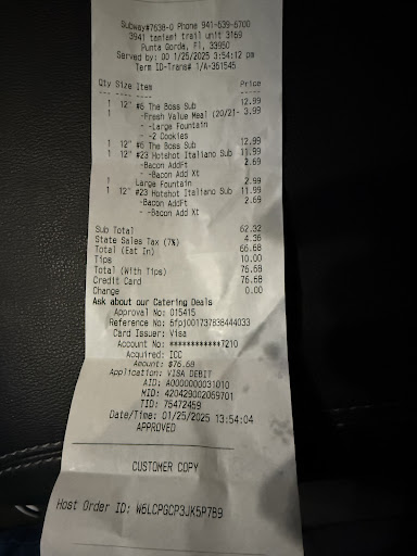 Read moreVisited 7/28/'24 @ 12:30PM. Served by '85'. I requested that she put the meat and cheese on ones side of the bread and veggies on the other side. Otherwise, it causes the sub to split and fall apart. I also requested that she un-clump the veggies and spread end to end. We were multi unit franchisees for 30 years, and these have both been long-standing policies of Subway. I also ordered an item which 'server 85' decided I didn't want/need and put it back. We were the only 2 people there yet there were dirty tables. Food was good and fresh. I suggest "spaced retraining", something we did in our corporation which was quite affective. We are generous tiopers but 'server 85 was, unfortunately, not...