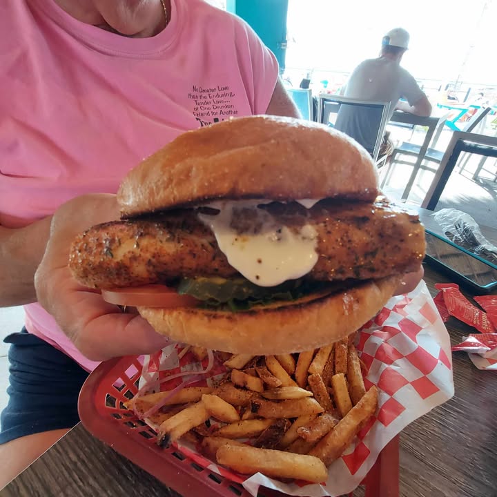 Both plates were served within 15 minutes, and they were both more than expected. The grouper fish and chips dinner was large, prepared perfectly with a firm, tasty crust, and the fish was moist but not soggy, which is sometimes difficult to find, since fish can be too moist for my liking, although I do order it dry. This grouper did not have to be ordered dry. It reminded me of the traditional fish fry we are accustomed to in Western NY. The breading wasn't too thick, and the fish was flakey. The fries were also nicely prepared with browned edges, and a firmness that allowed for dipping into tartar sauce or ketchup. The fries were flavorful, if not a little salty. I was happy with the meal in total.