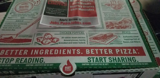 Read moreI’m sorry but I waited 2 hours for my pizza and I still didn’t get it. I rate a 1 star because the pizza at Papa Johns is amazing but slow service! Got one person delivering orders and I have to always wait 1-3 hours for my pizza. I get that they are busy but we almost had to cancel our order…the place had no idea and no contact with the delivery person. So far waiting on my pizza and it has been at...