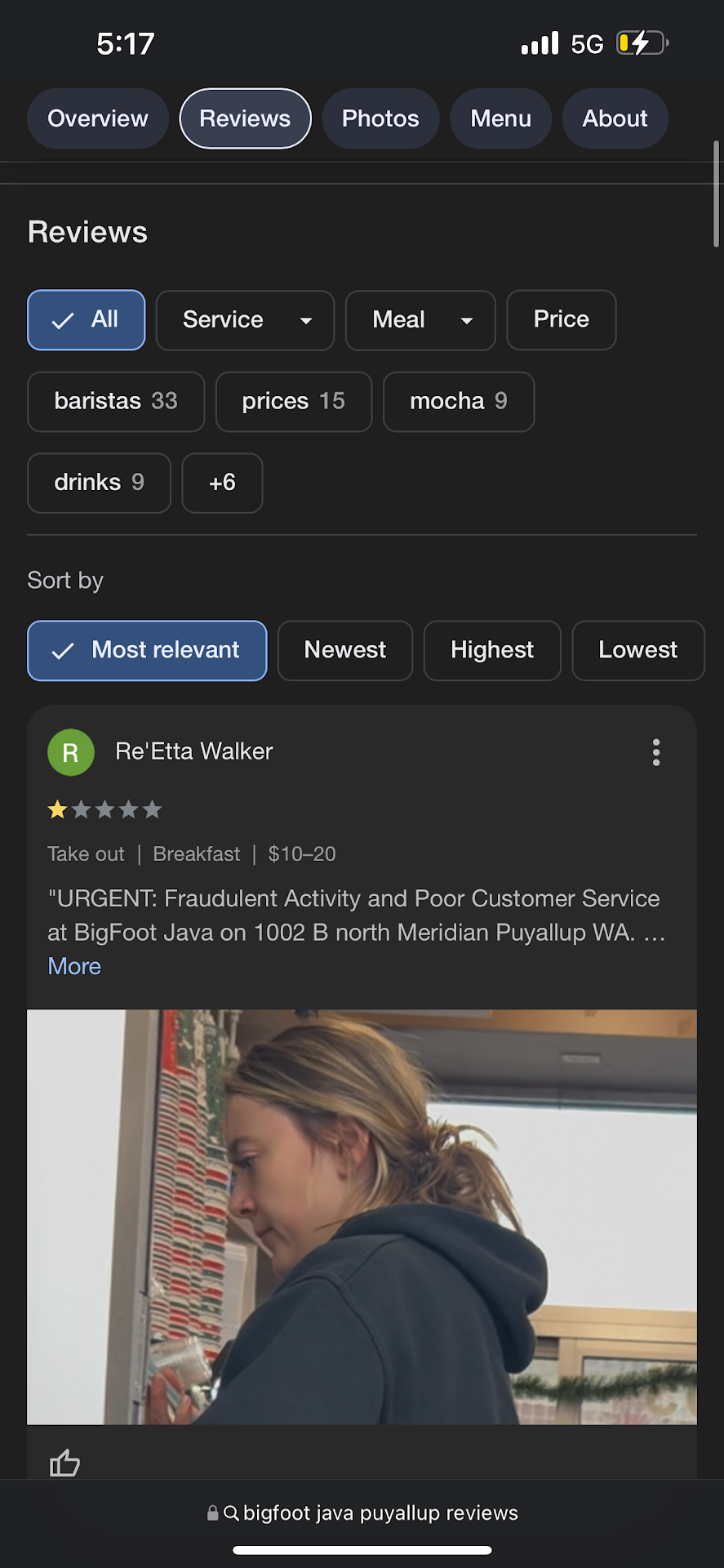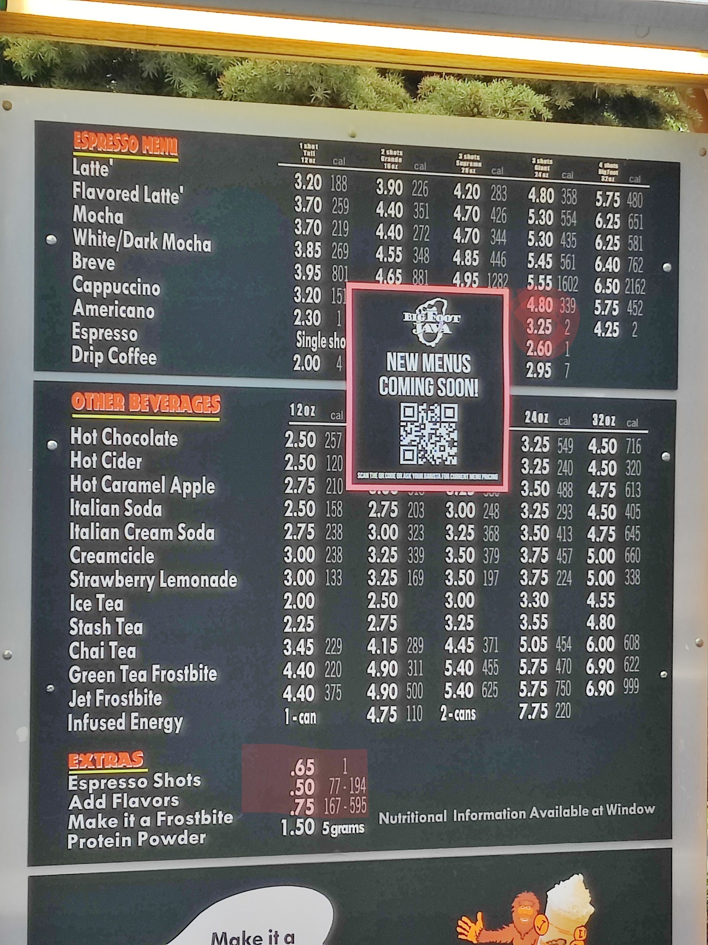 Read moreI'm so mad right now! I've been a loyal customer of Bigfoot java since they first opened, at least in my area. Well about 18mi from my house lol but of course I went. So today like no other my mom and I go to get coffee and we ordered our coffee, I first ordered mine which was supposed to be a 16oz White coffee, HOT! SUPER super sweet Bigfoot extreme and then I ordered my sister's drink a 12oz blended White coffee mythical mocha, easy right? Then my mom ordered a 12oz mythical mocha, REALLY easy right? NOPE! Mom got a 12oz Luke warm, if that white coffee, mythical mocha! (Completely wrong btw!) Sister got a 16oz iced White, coffee super, super sweet, blended mocha! (Also completely wrong btw!) Then I got my coffee a 16oz iced no flavor, White coffee, Bigfoot extreme, ( which was also completely wrong!) it was the worst visit any of us have had at any coffee stand! I'm so disappointed right now, we paid almost 20 bucks for coffee none of us are gonna drink. Between 1-10 1 being the worst this is definitely a 2 and I give it that cause the girls were nice. I will stay loyal to my girls up at the Bonney Lake Bigfoot java but as far as any other Bigfoot I will NEVER EVER go to any of them!...