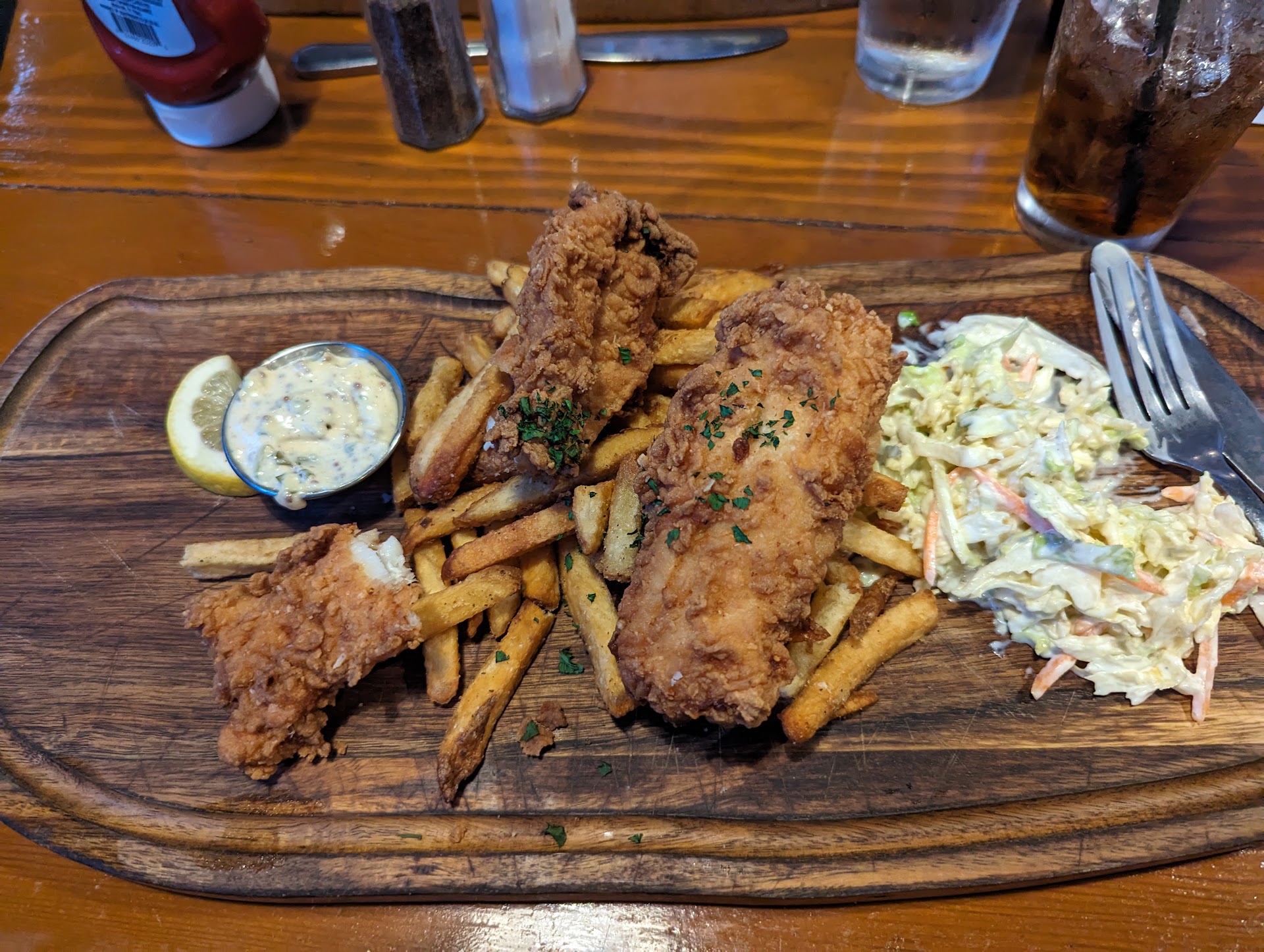 I ordered fish and chips. The fries were dark brown and dry like leather. It was clear they were leftovers that had been deep fried a second time. The fish, if not the same as the fries, was definitely overcooked. This left the fish dry, flavorless and unpleasant to even look at. The cole slaw did seem fresh though I found it to be very bland, flavorless.