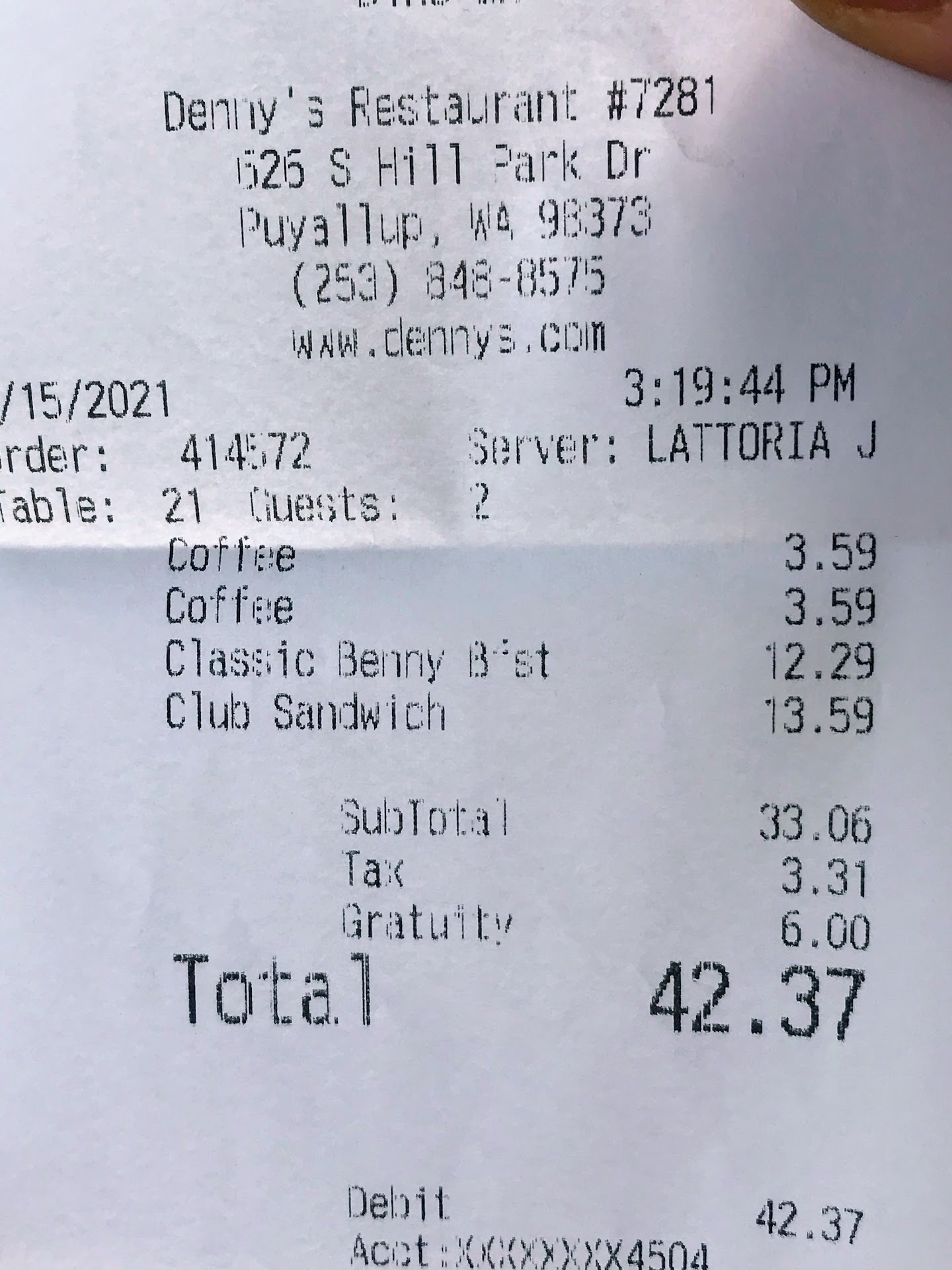 I would recommend eating here. (Note: This review is locational, and is about the location shown on Google Maps. Not a review of all of Denny's nor any other Denny's but...