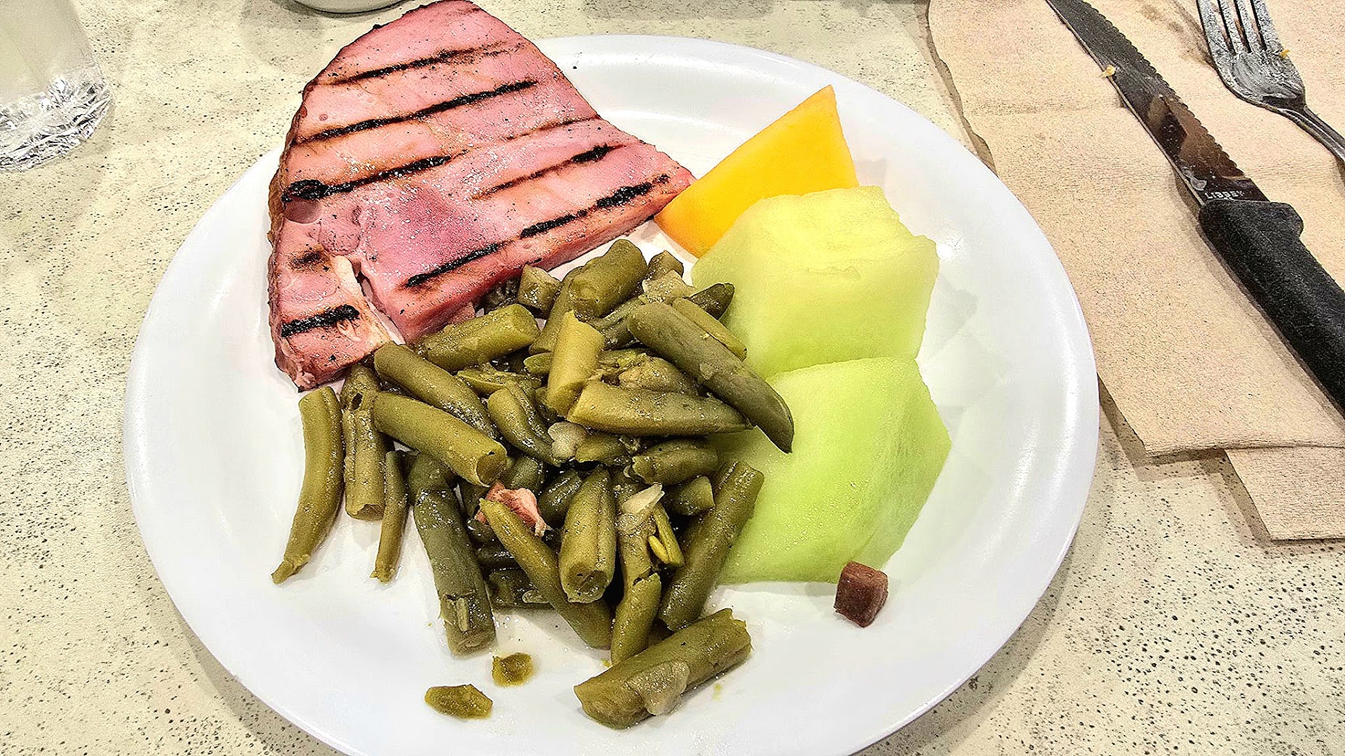 The atmosphere was relaxed, as it wasn’t overly busy, and the salad bar was fully stocked with fresh options. However, the hot items could have been presented more attractively. Some of the labels on the food items were also incorrect. For example, when we arrived at 6 p.m., the signage indicated oatmeal and grits were available, though they were actually serving soups. Additionally, the main protein options could have been better stocked and replenished more frequently.