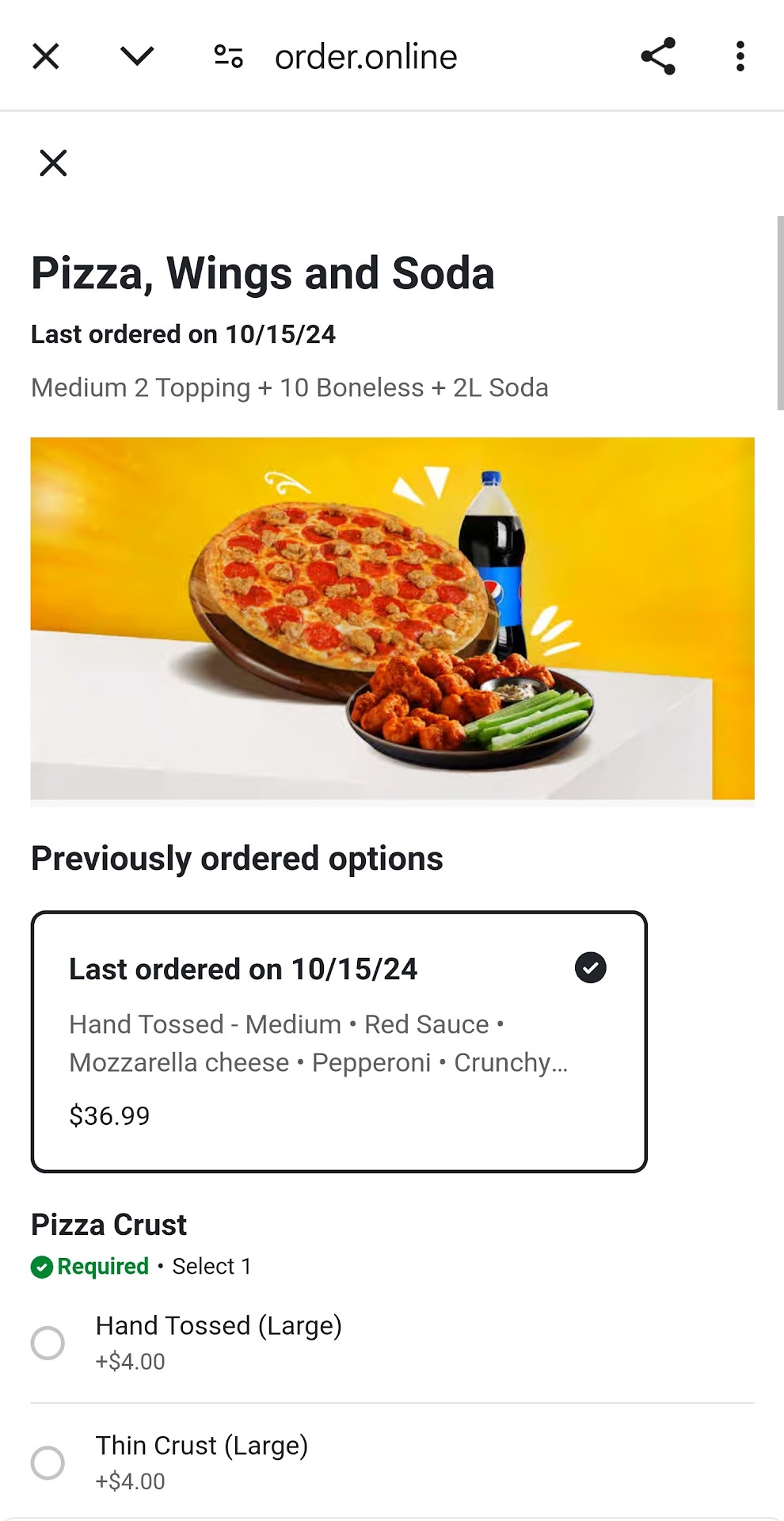 They had a combo deal online of two topping medium pizza, 10 wings, and 2 liter soda. Sounded like a good option for dinner for husband and me. When I went to go pick it up, the guy asked if I wanted a can or bottle of coke, I stated that it was actually a 2liter. He literally made a face, scoffed, and said no in a tone of voice that implied I was crazy, an idiot, or trying to scam him. We looked down at the receipt he had handed me to try and clarify this situation and all it said was "1 COKE" so the guy says, "see, no". I just left. I wasn't about to argue with this jerk over a few dollars worth of soda.