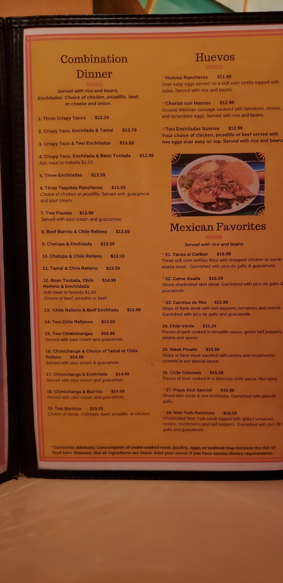 Read moreI read the other reviews and I'm left wondering why everyone rated the food so well? I can only figure that these people have either never had any REAL Mexican cuisine, or that they prefer the over-Americanized, spice less, over-cheesed glop that they serve here. For crying out loud, they can't even make a proper Chile Relleno!!! I was served a hard omelet with a small 'canned' chile and a ton of cheese. Nothing was seasoned or had any spice at all. Even the two salsas, which were served with the chips, had no detectable heat. One was just red tomato sauce with a couple of onions and the other was just some blended tomatillos and onion. Needless to say I was left very disappointed. I won't be going back. Even cheap chains like Mazatlan, and Puerto Vallarta are better and I won't eat there either. Ugh! Please people go out and have some REAL Mexican food so that you can tell the...