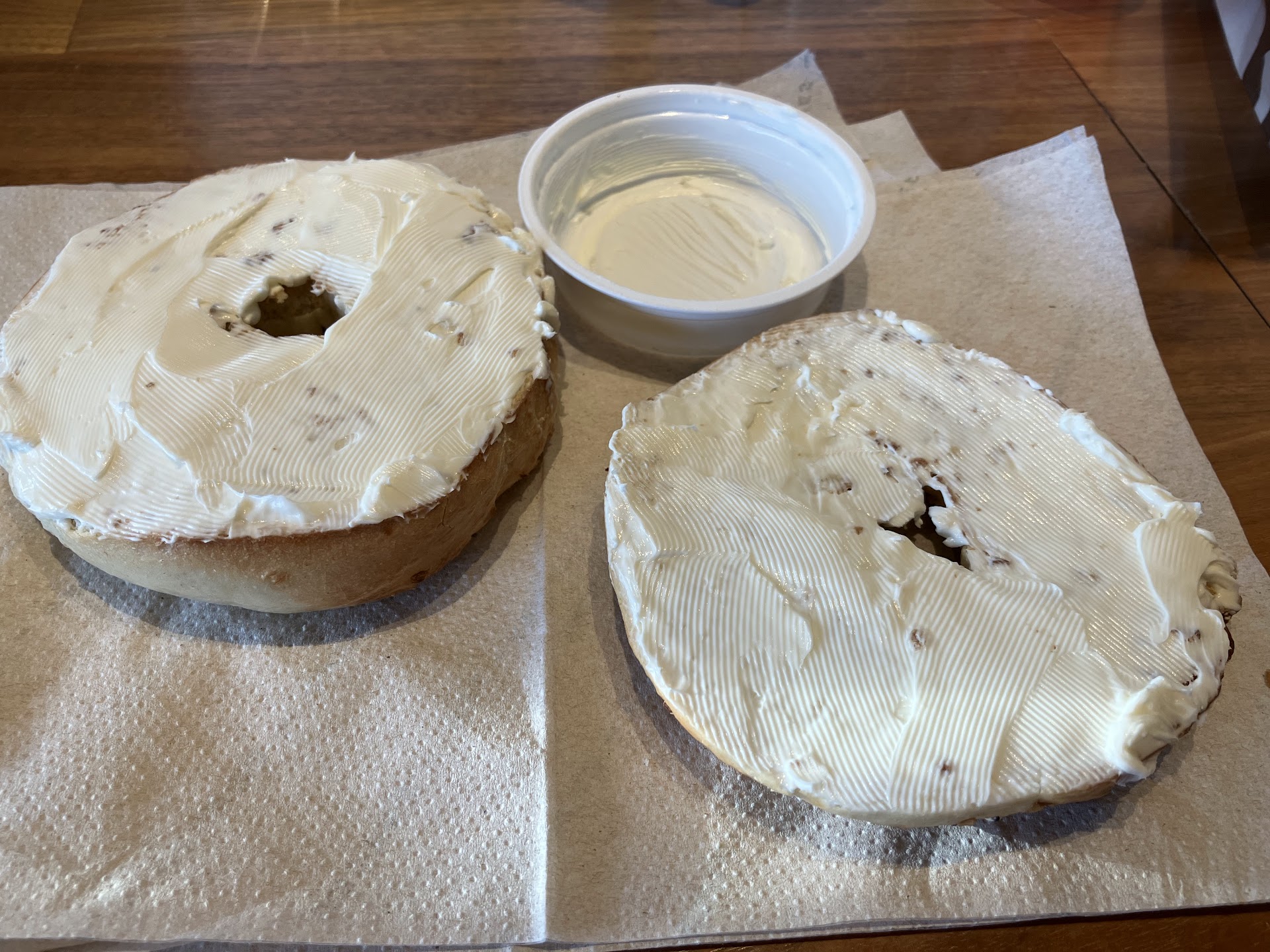Good food, but the prices are hiking up! 😱 I just found out today that a 1.5 oz of plain cream cheese costs almost as much as an everything bagel 🥯. Holey moley! The total for my order is $4.79 just for those two things. Buying one item is now close to $5 in all sorts of ways. It used to be between $3 - $4. The bagel itself costs $2.65 and the cream cheese itself is $1.25. Look 👀 at the size difference in the attached photo. There needs to be a price reduction for affordability. This pricing doesn’t make sense as dips at other places cost .25 cents. I asked the staff and it was confirmed with consistency to in-store pricing and online ordering through their app that this is the correct pricing. Please try to notify headquarters of this change as I am.