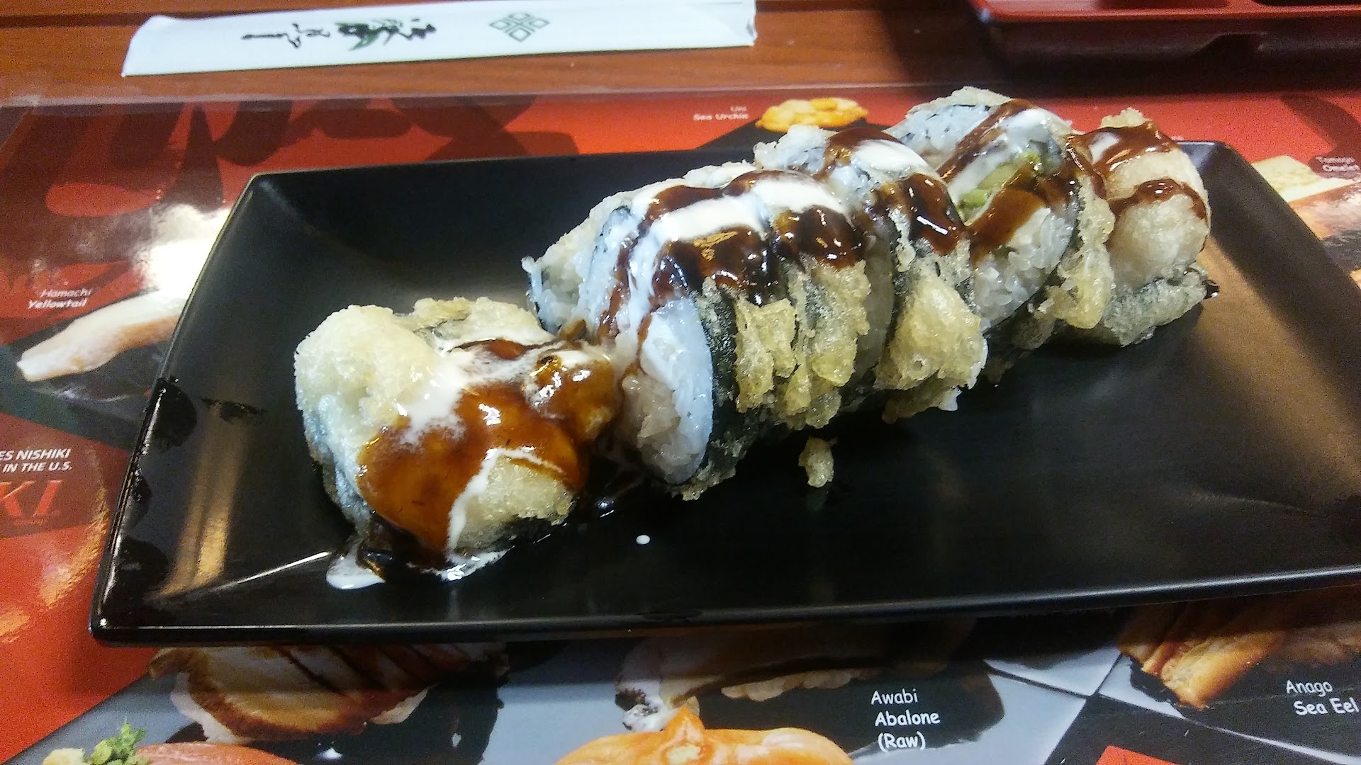 That brings me to the next part of this review. Food quality is less than what you'd expect at a normal Japanese sushi restaurant. They're not bad, let me get that straight. Especially for the price I'll keep eating it. However, pretty much everything comes with the same mayo and eel and some other yellow sauce. Sometimes it comes smothered in it which is not good at all. They're rolls are definitely interesting, but they also seem very similar to each other. Hard to explain. Anyways, for the price it's worth it.
