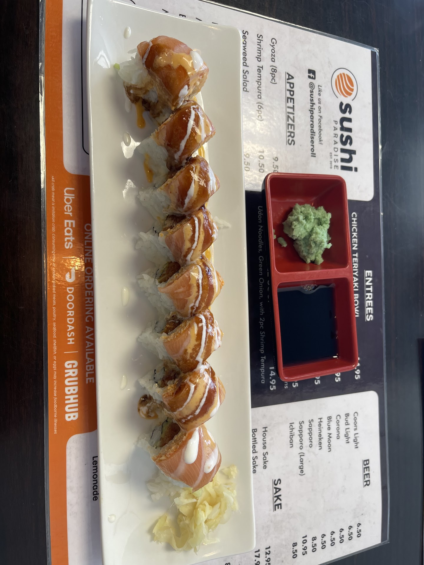 Read moreOk, so I have been wanting Good Sushi for a while and wanted an all you can eat place. Sushi Paradise did more then just meet my standards they surpassed them by leaps and bounds. When we got there I wasn't sure what to expect because I read the reviews on here and everyone seemed impressed but when we got there the place was empty other then a women and the man behind the sushi bar. We were greeted by the women who was very friendly even teasing My husband and I that they had been there five years and what took us so long to come for a visit, she quickly got us to are seats at the sushi bar (very pretty) and took are drink orders (Ice Tea) and even took the time to explain the Menu a little for the all you can eat sushi rolls. The chef making are sushi rolls did an amazing job he was friendly, polite and also asked if we had any questions, He was very fast with are sushi orders. Each order was just as good if not better then that last after every roll we were impressed even more and when we told him it was are 3 year wedding anniversary he asked if he could make us something special and we agreed he made the most amazing sushi rolls with a lightly torched salmon on top and also decorated the plate with Orange slices, whip cream and a cherry on top and lit the orange skin on fire on top of a wine glass in the center to blow out for good luck. The sushi he made us that wasn't on the Menu was to die for and one of the things I liked best of all was that even after we were super full he still wanted to make us more sushi we walked out of there with are tummy's so full I felt like we could have exploded. We will be going back here from now on when we want Sushi for dinner or Lunch. I truly cannot express how impressed I was with there Sushi...