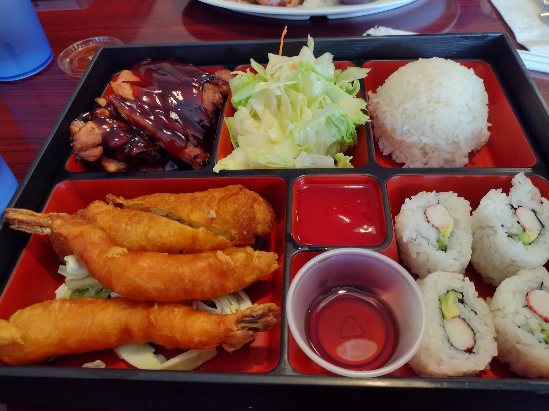 Daughter ordered the Teriyaki chicken and Katsu lunch combo special ($12.99), and I ended up with Bento B which consisted of Teriyaki chicken, 4 pieces of sushi, 2 pieces of shrimp tempura.and an eggroll ($14.99). Both orders came with a refreshing small salad as well.