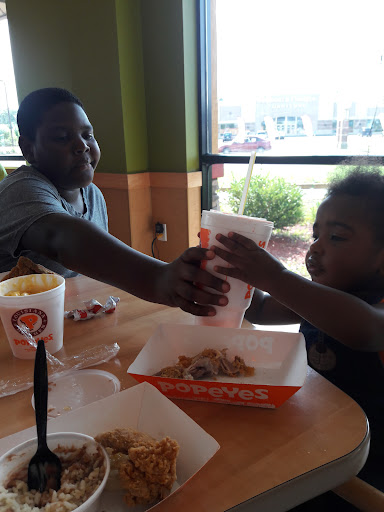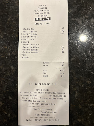 We stopped here to try the new pickle menu items. The drive-thru is very tight. Not their fault, but something to note. It was tight in my Buick Encore, had we brought my husband's F-150 like we had planned it would've rubbed the gates and drive-thru window. There was a delay before someone took our order and a very long delay at the window waiting for someone to take our money and again between getting 1 drink and the remainder of our order. We were in the drive-thru for a total of 8 minutes. We got about 5 minutes down the road and realized they forgot to give us our pickle lemonade. We called as we were turning around and spoke to the manager. He did not apologize but did offer to give us a free item when we returned. I walked in, there were 2 parties ahead of us. 1 couple who had ordered long before and was waiting for there food and another couple who had ordered on the app and added 1 item in store. I waited 4 minutes just to be addressed by staff, when I told them that we called and they forgot an item the f.o.h. staff seemed surprised, when I said we were promised an extra item he put his hands up and said, "that aint me, that's them" pointing to the back. The manager heard me, popped his head out, confirmed what I was waiting for and dispensed a pickle lemonade, put it down and walked away. I waited an additional 4 minutes for the manager to pop back out, pour a 2nd pickle lemonade, put them in a carrier and mumble sorry without making eye contact when earlier he spoke loud and clear and looked directly at me. The fried pickles were dried out, the glaze on my sandwich was non existent, the only thing that was good was the lemonade. I already don't usually eat at Popeyes, this experience backed...