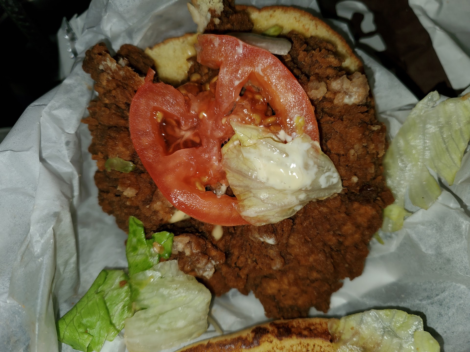 I was permanently damaged by the way the bun slurped from the paper and began to leak its gallon of honey mustard all over my once clean appendages. After I carefully weighed the options that lay before me. To risk the possibility of a future which included the consumption of the atrocity that lay in front od me, or retreat to a safe distance and enslave myself to the harsh embrace of hunger. After I made the now regrettable choice I did, I then slowly made it through the layers of honey mustard soaked buns that had morphed into a gooey mass of sludge, touched by a hint of day old shredded lettuce fragments which adorned what was to be at best described as yesterday's pidgeon that had been struck by a mack truck. Dry, lifeless, unseasoned but cooked thoroughly patty of meat kissed by lines of the 'grill'.