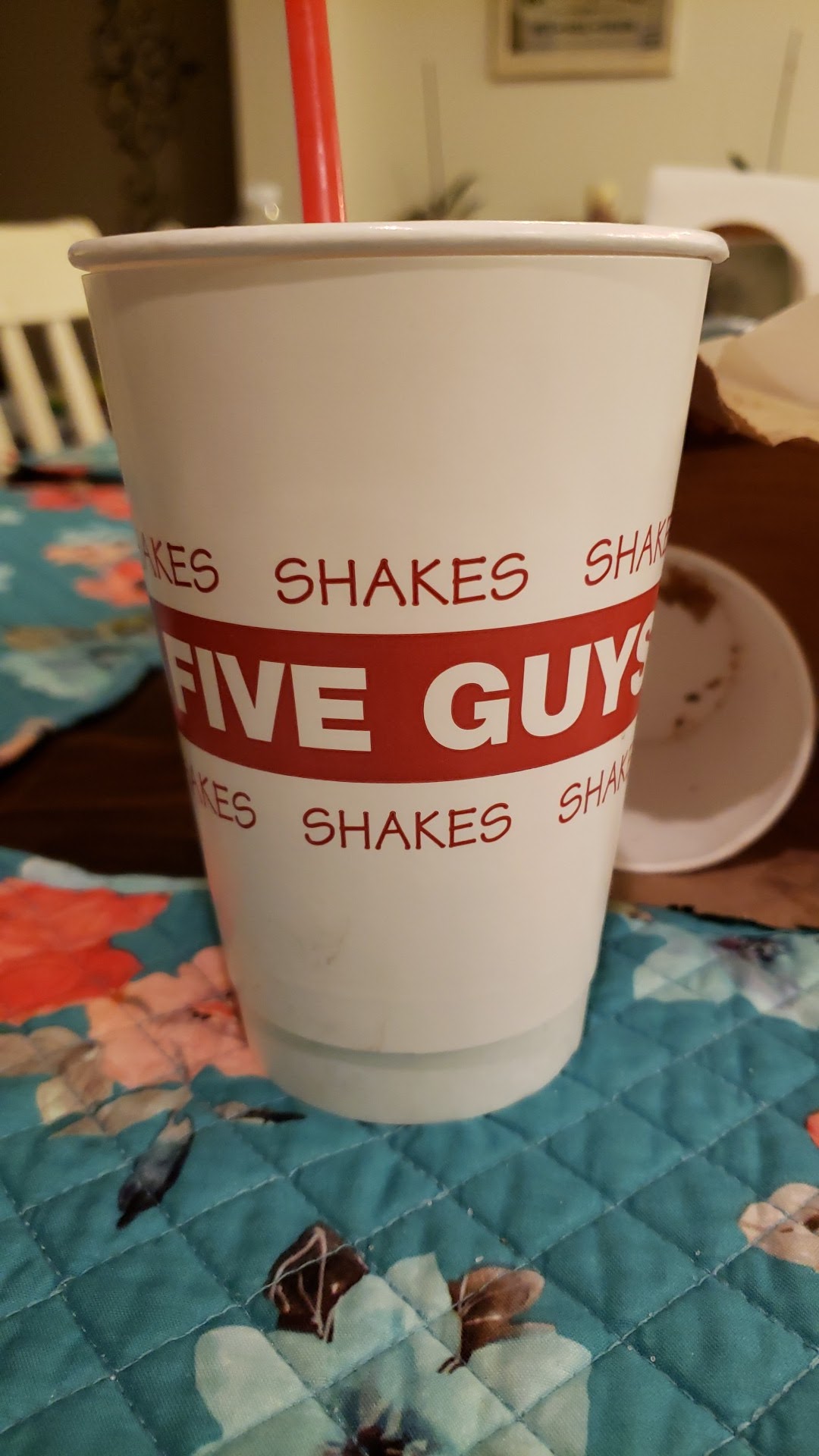 Read moreI don't think they should be delivering food. Their product isn't accurately represented by what is experienced when delivered. Or so I'm told. This was my first five guys order. I ordered for lunch to be delivered by postmates. The burger was still warm. But the bread was soggy. The burger fell completely apart and was a huge mess. But the most disappointing part was that my strawberry shake was completely thawed. I could've had a better experience had I just blended a few strawberries with a cup of milk. So,I paid $5 for a small cup of milk with a few chopped up strawberries in it. For $5 I was expecting the best milk shake experience ever! What I got was the worst experience ever! But,to be fair,I will try them again when I have time to stop in and have it fresh. I will give an update then. Just wanted to warn people about the delivery experience. I spent $16 and change for a soggy burger and a warm shake. And I didn't even have...