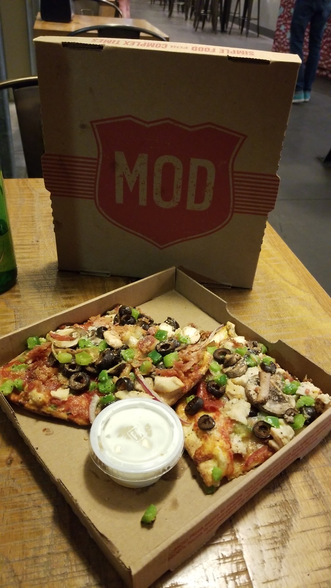 Read moreWe've been here a few times, and never had a bad experience. In fact, the employees are typically affable and easy to talk to. They listen well, and get the orders right every time. This particular time they forgot to add my pesto sauce onto the top of my pizza, but mistakes happen so it was no big deal. I love being able to create my own pizza, but my favorite from their menu is the Dillon James. I also very much enjoy tasting their various flavored no-name cakes. The chocolate one is okay, and the one that is most often available, but the seasonal ones keep me coming back to satisfy my sweet tooth! The pumpkin spice one they have right now is amazing, as is the strawberry lemonade one. Yes, the frosting is a bit waxy, but I still love them maybe because they are a throwback to my childhood when we would eat the other cakes that shall not be named. :) Definitely recommend Mod for a nice, quick (ish) meal. There's plenty of seating inside and out, though I agree with other reviewers that sitting outside at night can be a problem because cars park and leave their headlights shining right on you while you are eating. It's kinda uncomfy but not a huge deterrent. One thing I love about Mod is that they are a second chance employer.
