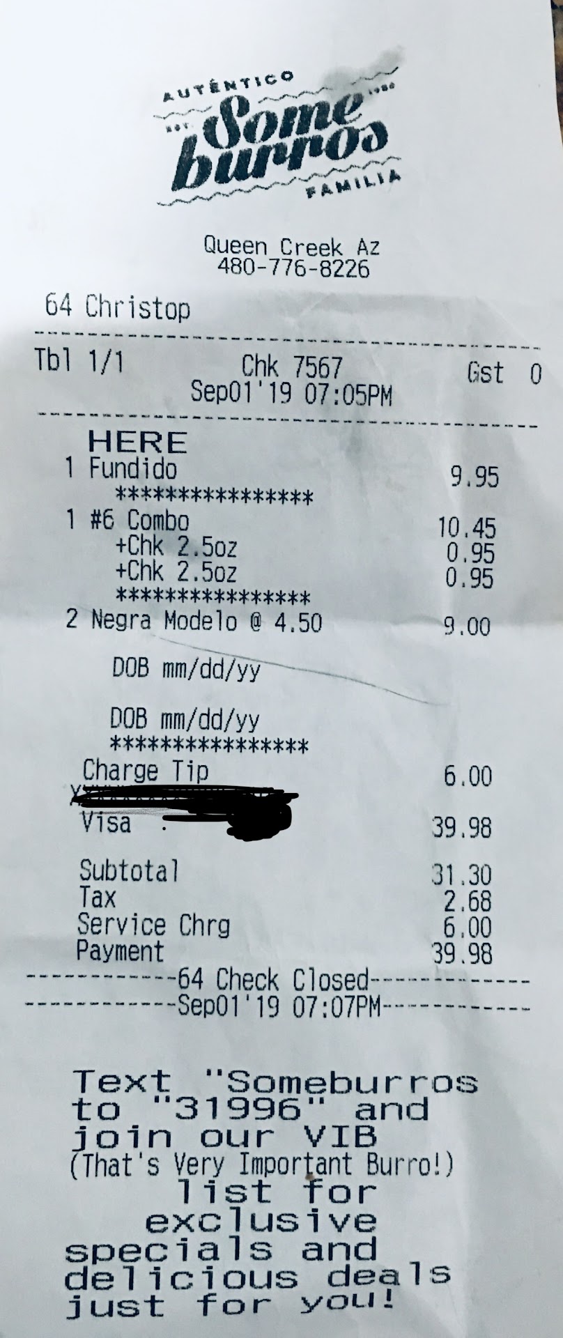Read moreSince the drive thru started taking orders, the dine in service has declined tremendously. The counter service is very nice, however; our experience just last night with the food quality itself and the time it took to get our food wasn't acceptable. I saw the food going out for the drive thru orders as priority. We waited 25 minutes to get our food and when we got it it was cold; not even warm. The cheese quesadilla looked like it had been "dropped" on the floor. I even ended up taking the cheese crisp back and told them it didn't even look appetizing. They asked if I would like it to be remade to which I said yes, please. We then waited another 10 minutes for the remade cheese crisp all the while, they brought out one to another dining couple. That cheese crisp looked really nice. We waited another 5 minutes after that couple got their cheese crisp which should have been ours! We were finished with our cold meal by the time we got the remade cheese crisp and so disappointed because it looked like they just put some more cheese on it. It looked just as "thrown " together as the first one did! Maybe I'm just old school but when I pay for a meal at the prices that have skyrocketed, ans I am dining INSIDE the restaurant, I expect my meal to be hot and atleast look appetizing! At the very least, we should have been offered a $5.00 gift card for our wait time and the slop we were given called a cheese quesadilla. My suggestion to Some Burros restaurants, you need to make sure your dine-in customers are taken care of first! Before you started taking orders through the drive thru, your service inside was great. If I want slop Mexican food, I will go...