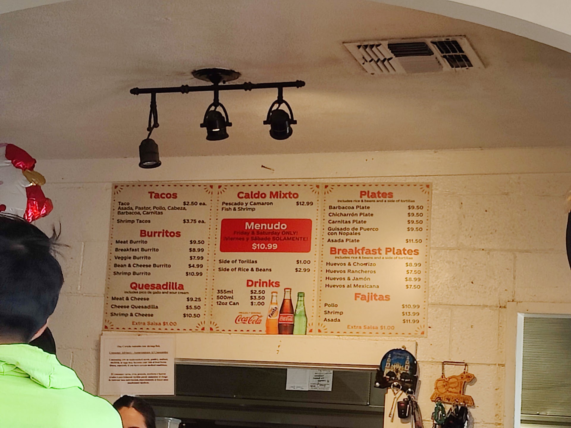 Read moreThis place had great reviews so we decided to try it. It is definitely a hole in the wall place....but often that's where you find the best food. It is definitely popular because there were probably 20-30 people standing around in there waiting for their orders... And it is a tiny place. There are only four tables. A whole slew of construction workers were in there, so you know it's good. The food definitely was good and my dad's loved his menudo...very hearty, but my chicken taco and my mom's pork burrito hard hardly any meat on it...that was disappointing! The service was not great either. They were nice, but everyone in there got their food before us.... Even 10-15 people who ordered after us (and we ordered the same thing). It was difficult not to feel like we were not as important because we were the minority (the only Caucasian people in there). I felt like they were playing favoritism to their ethnic group unfortunately, and that wasn't nice. I finally got up and stood in line to ask if we were forgotten, but then they finally...