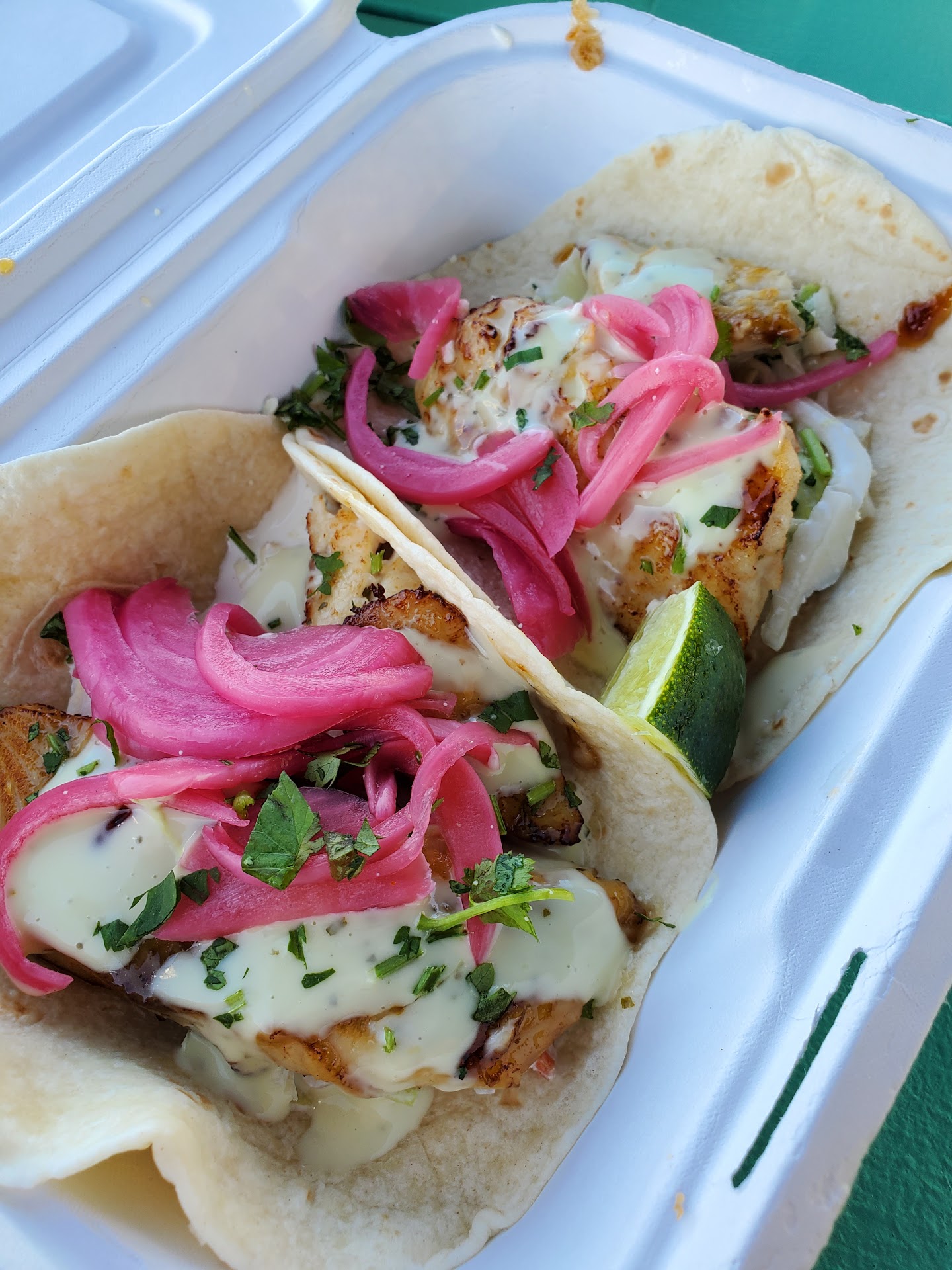 I love the grilled chicken tacos marinated with cilantro lime and served with cotija cheese. The Salsa Verde (extra) goes perfectly with it.