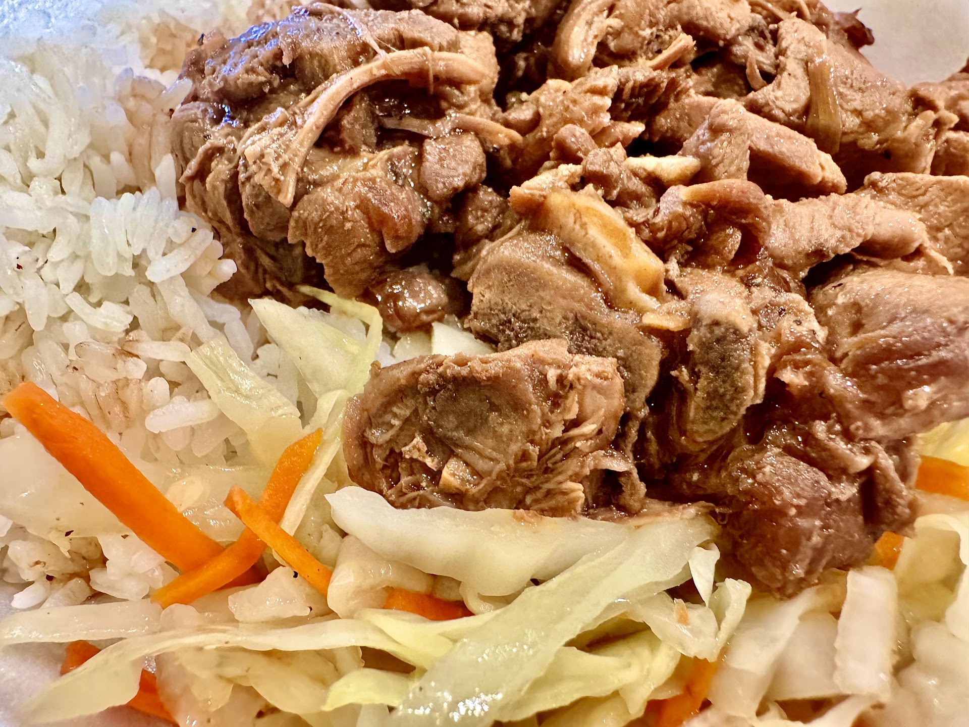 Adobo Chicken with rice and, I think, Ginisang Repolo: delicious, but the chicken was LOADED with tiny bones. Much of it was bone, and, me being fragile, I couldnāt eat much of it (I actually may have chipped a chip tooth more, despite my great efforts to feel for bones before biting down). The seasoning and whatnot was fabulous, but I donāt like risking chipping a tooth to eat. If the chicken was chicken breast or something with more meat and less bone I would have enjoyed. I know eating primarily muscle tissue only is not the way of much of the world, so I accept that, and the food was good.
