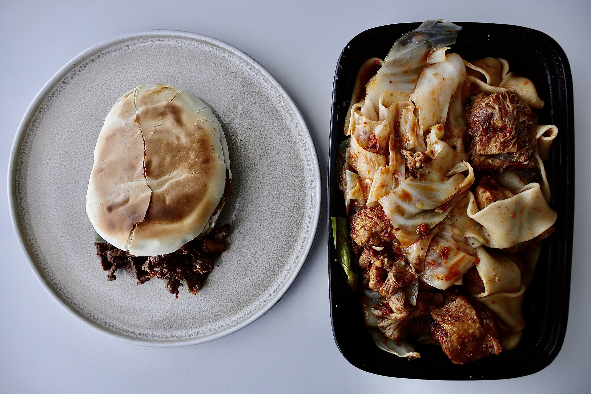 I ordered two items for take-out, which took 10 minutes to prepare on an empty morning. No issues with service. Spicy Cumin Lamb Burger ($6.95): Decent amount of lamb for an appetizer. The lamb was aromatic but dry and not that spicy. The dough was also dry but held up well. I wouldn't get this again. Spicy Chicken Biang Biang Noodles ($12.95): Filling for the price but more noodles than chicken and only two pieces of vegetables, so the ratios could be better. This dish was also not that spicy. However, the chicken was flavorful and not dry like the lamb. The noodles were chewy and al dente but a bit too oily.