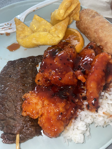 Orange chicken white rice and beef teriyaki, egg roll , side of crab Rangoon service was so nice prices are cheap they give a good quantity and it is quality food will be back to try more !