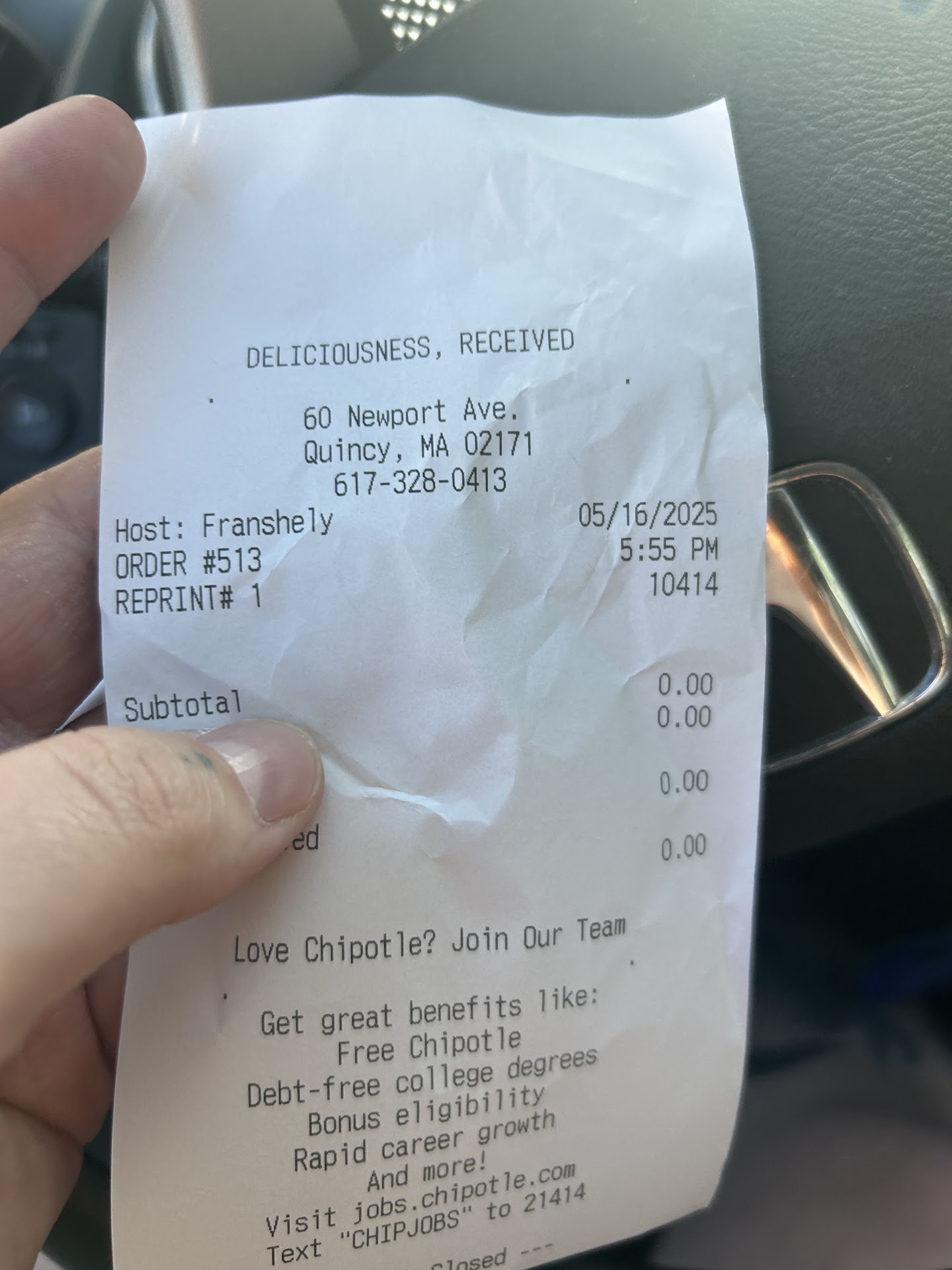 I call chipotle corporate and they need the person’s name-so I go back inside to the register with a pen and ask the cashier “what’s your name?” And she goes “I don’t have a name” and I turn to the other worker “what’s her name” the person goes “don’t worry about it” I then snatched the receipt out of the machine because I know it has the person who’s logged in name. Again, FRANSHELY. Obviously this ticks her off but here’s the thing: