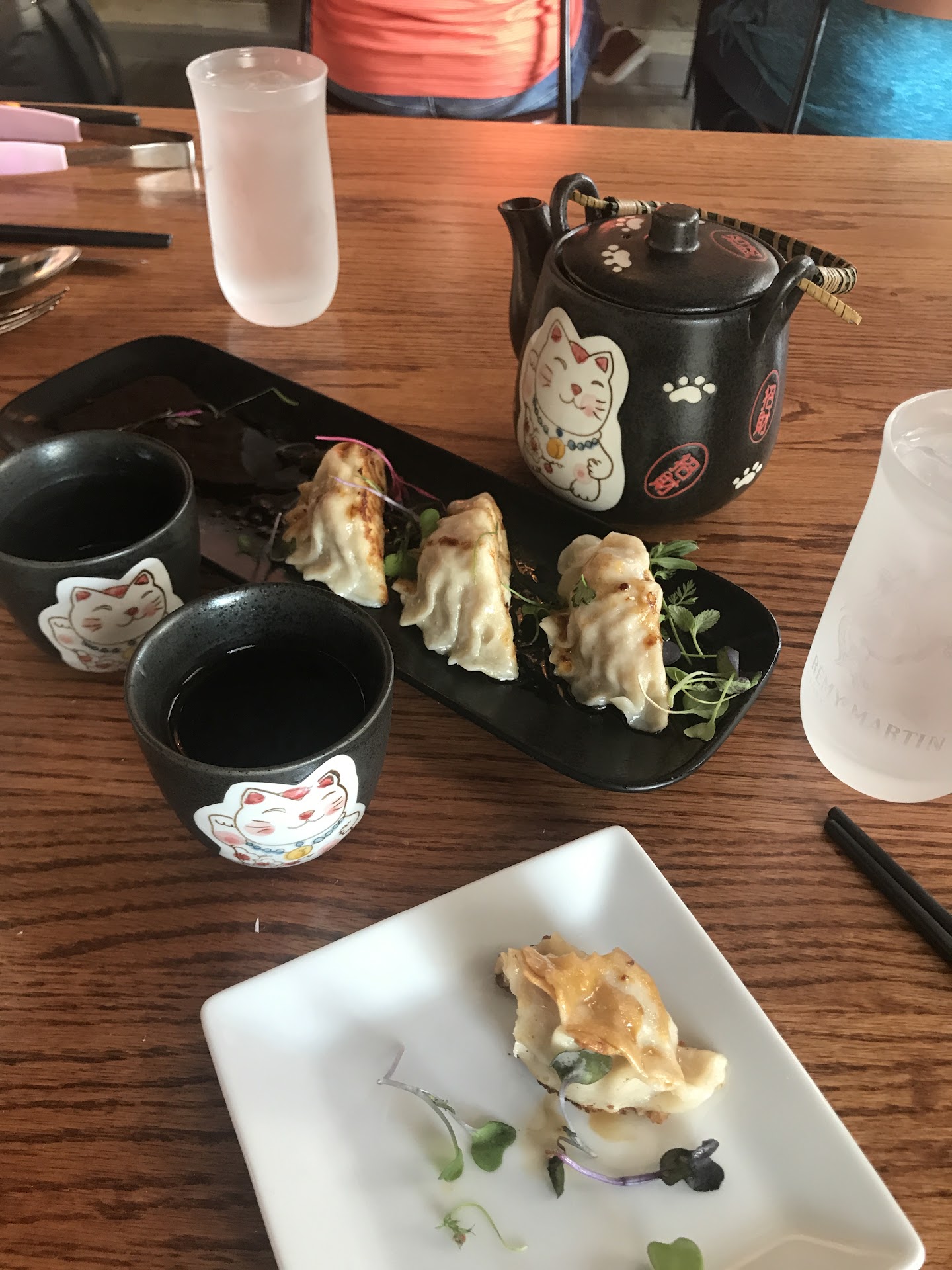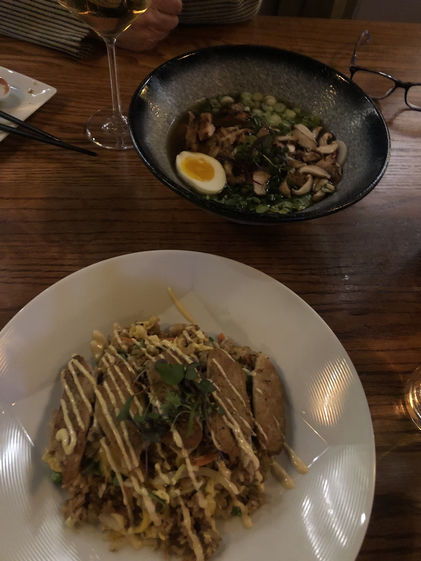 The ramen was closer to what I've had in Japanese restaurants with a soft boiled egg, scallions, noodles, chicken, and hearty broth. But it also included some herb I've not ever had in ramen (maybe basil?) that took away from everything else