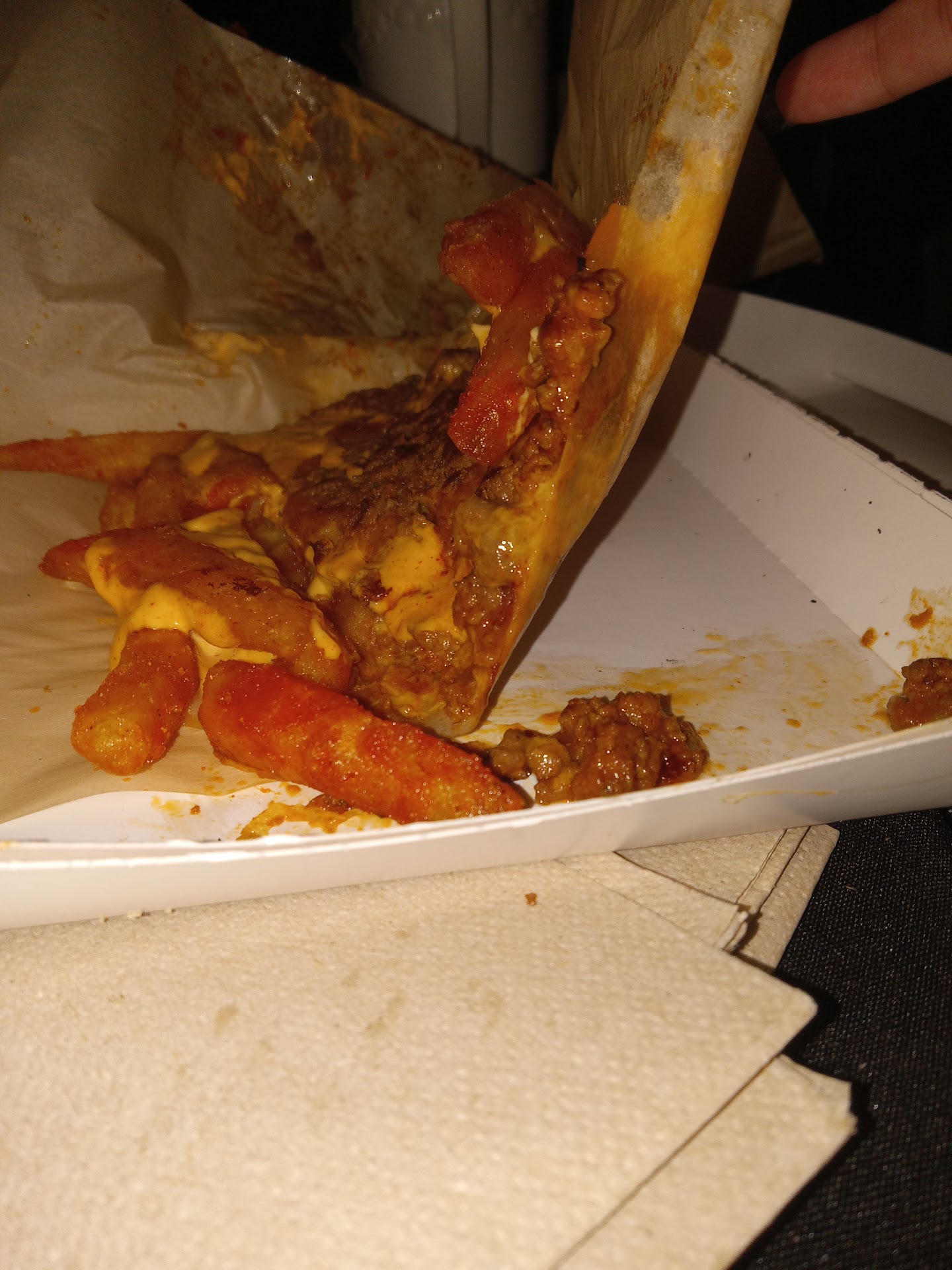 Read moreBetter quality on 9th and Broadway...that was my review 5 yrs ago but they had just opened then, now fell into the quincy comfort level of quality 5.99 for the new grilled cheese nacho fries is fine but save your money. Well don't go at night cause they just trying to get out of there the guy taking my order on drive thru kept cutting me off to complete my order for me I kept apologizing for his interruptions get to the window to be given my drinks and told have a nice day , didn't mind waiting it was the stares of why is she still here that was awkward lol then the 10 fries drowned in Baja sauce flattened at the bottom of the bag was the icing on top. It's fast food I don't expect a grand show but do expect slightly decent service to make up for underwhelming food or vice-versa. The photo will show where I lifted one frie and was at the bottom of the tray might not have been so bad if it wasn't smashed still a smaller portion but I need to diet anyways stop going for the...