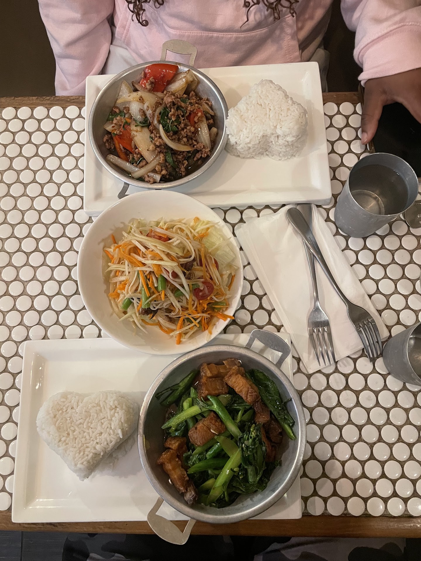 Read moreJust came to the area, found this little spot. I was a little sad when I tried to order the tamerand duck and they were out however the Food was amazing. We got ground pork preserved eggs ka prow, Chinese broccoli with crispy pork belly and the Thai papaya with fermented crab. Everything was delicious. I would say I was not a fan of the soft shell on the crab in the Thai papaya salad, but thats just my preference. The ground pork with preserved eggs ka prow, was not as spicy as expected but it was very tasty and the preserved eggs were so good. The crispy pork belly was juicy and had a delicious crunch, the Chinese broccoli was soft and tender, at the end I poured the sauce from the bottom of the dish over the rice. It was soooo good. I really loved the heart shaped rice portions as well. I would definitely come back to this spot and try many other things off the Thai Thai part...