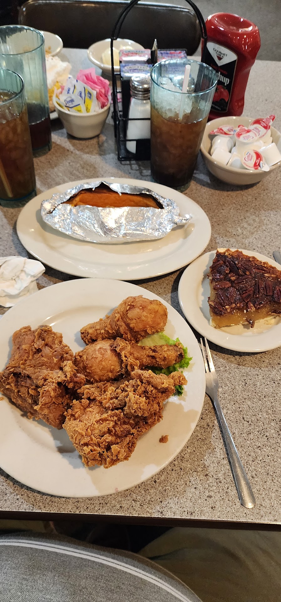 Read moreWe got the Thursday deal, fried chicken with a side plus the soup & salad bar. 🥗 When the new owners first started, they had removed the hot meats from the salad bar. They have now replaced them. 😋 The last I had heard, they also stopped the salad bar on Sundays, I don't go on Sundays now, as I always enjoy their salads. They also close at 4 on Sundays. Insufficient folks that have a desire to work. Really sad ethics in our America. Enough politics 🙄. We also had the sweet potatoes. It's hard to go wrong with those. And they were big, they got their own plate! We added dessert to our order. I had pecan pie, and my wife had coconut cream. Both were good. The chicken was hot 🔥 it burned the fuzz off my tongue. To me, that is great. I dislike barely warm food, I can always wait a bit to eat while it cools. And we took some of that chicken home. It sounds like breakfast to me! The waitress was friendly and helpful. This place has been around for years. It is one of Quincy's great...