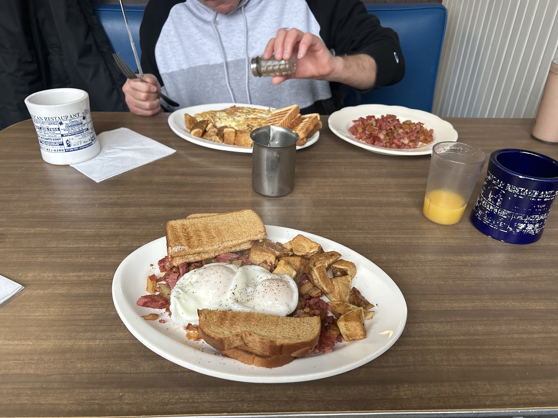 Read moreTwo stars only because I feel bad for this place. Ordered a broccoli and cheese omelet, was THE worst I have ever had. Broccoli was hard as a rock, no seasoning on the eggs at all, no flavor from the cheese. There was somehow very high water content in the omelet and was sitting in a pool of water. The potatoes were way over seasoned and not cooked enough, the potato was still hard. The toast, however covered in butter was somehow drier than the Sahara desert. The coffee was decent. But like, I order a coffee, it gets poured, then I'm looking around for sugar and spoon, the waitress was on here phone, didn't want to bother her so I found a table that had sugar, grabbed it and just stirred with my knife. For almost $20 for an omelet and coffee, this was a complete disaster. Thankfully (possibly the owner) overheard and stopped the waitress for charging me. I still tipped out of pitty for this place. On top of all that the "cook" started arguing with me about the meal and that he cooked everything right. I have toured the country as a live sound engineer and tour manager for 10 years. I have been to every city 15x over. I lived at greasy spoon diners on omelets and coffee. This place, by far the worst. Good location, kinda neat inside if you ignore the duct tape keeping some of the seats together. Better food will bring more customers. Just go on youtube, find any good diner and just copy exactly...