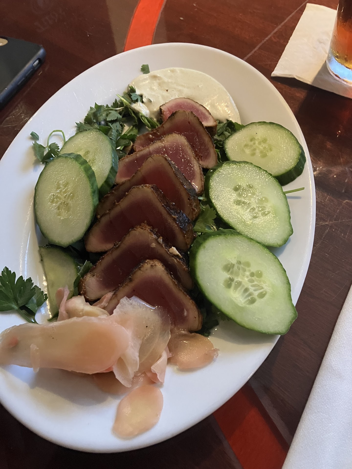 I am a big fan of this restaurant for many reasons. My recommended entrees are Seared Salmon // $18 Dijon cream sauce, jumbo asparagus, grilled mashed potatoes and Cajun Tuna Steak // $18 Cilantro lime aioli, jumbo asparagus, garlic mashed potatoes Salmon is perfectly moist, asparagus fresh, and garlic potatoes hearty. Tuna is sushi grade and tastes great raw but if you are paranoid chef can cook it well for you. Complements on having craft and artisanal beers in a town that usually does not have more selection than generic light beers.
