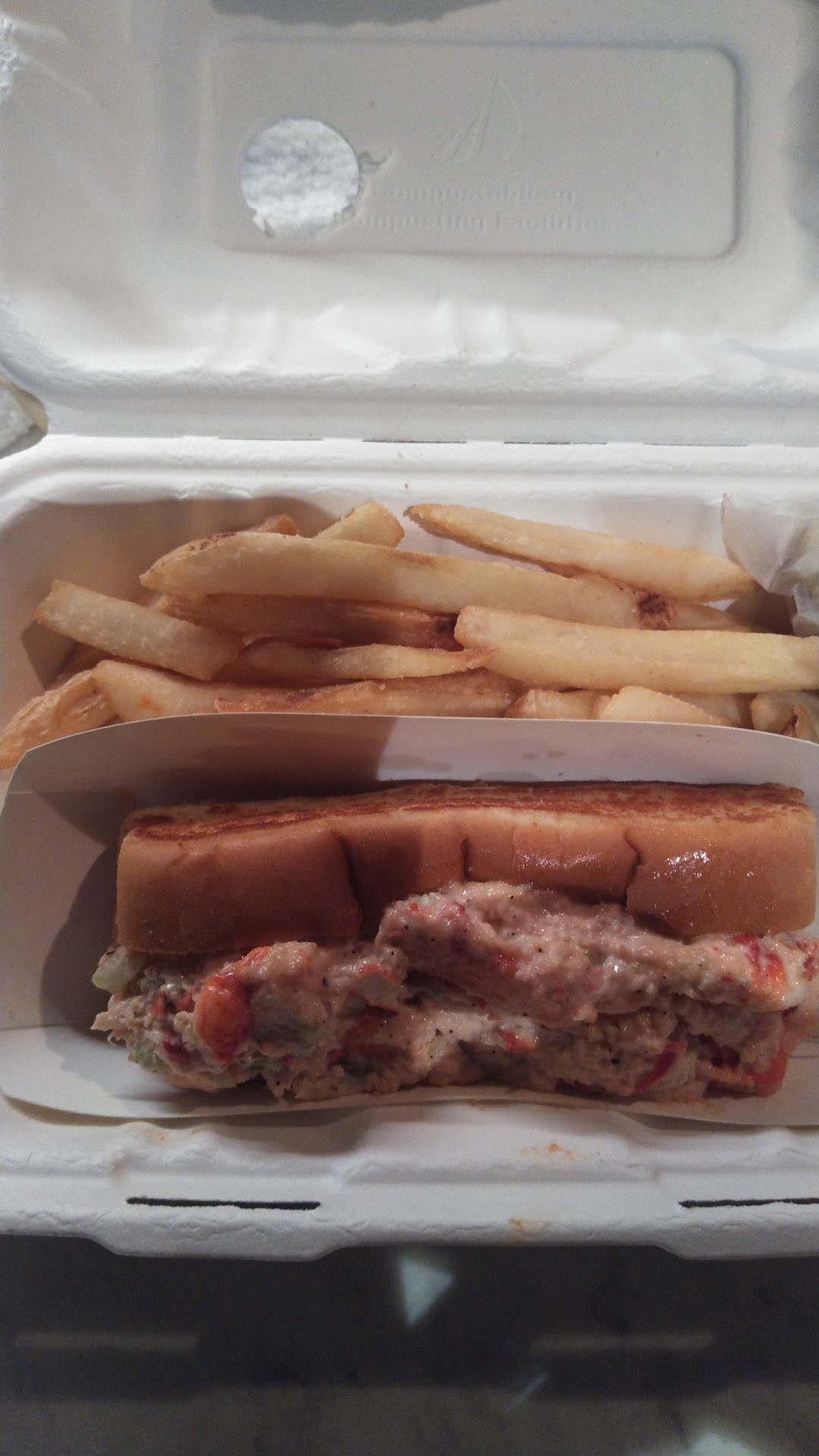 We got our order as carryout..I will say this menu is overpriced for what we ordered. We purchased one single Lobster roll w/ fries and Buffalo chicken tenders. Got back to hotel...open the container ( picture attached of the Lobster roll). I thought this item was going to be hunk pieces of warm lobster in a sauce on a Hoagy bun. I said, "What is this?" It looked like some lobster dip on a single slice of bread,which was $16.99. The chicken tenders were dry and overcooked, which was $14.99.