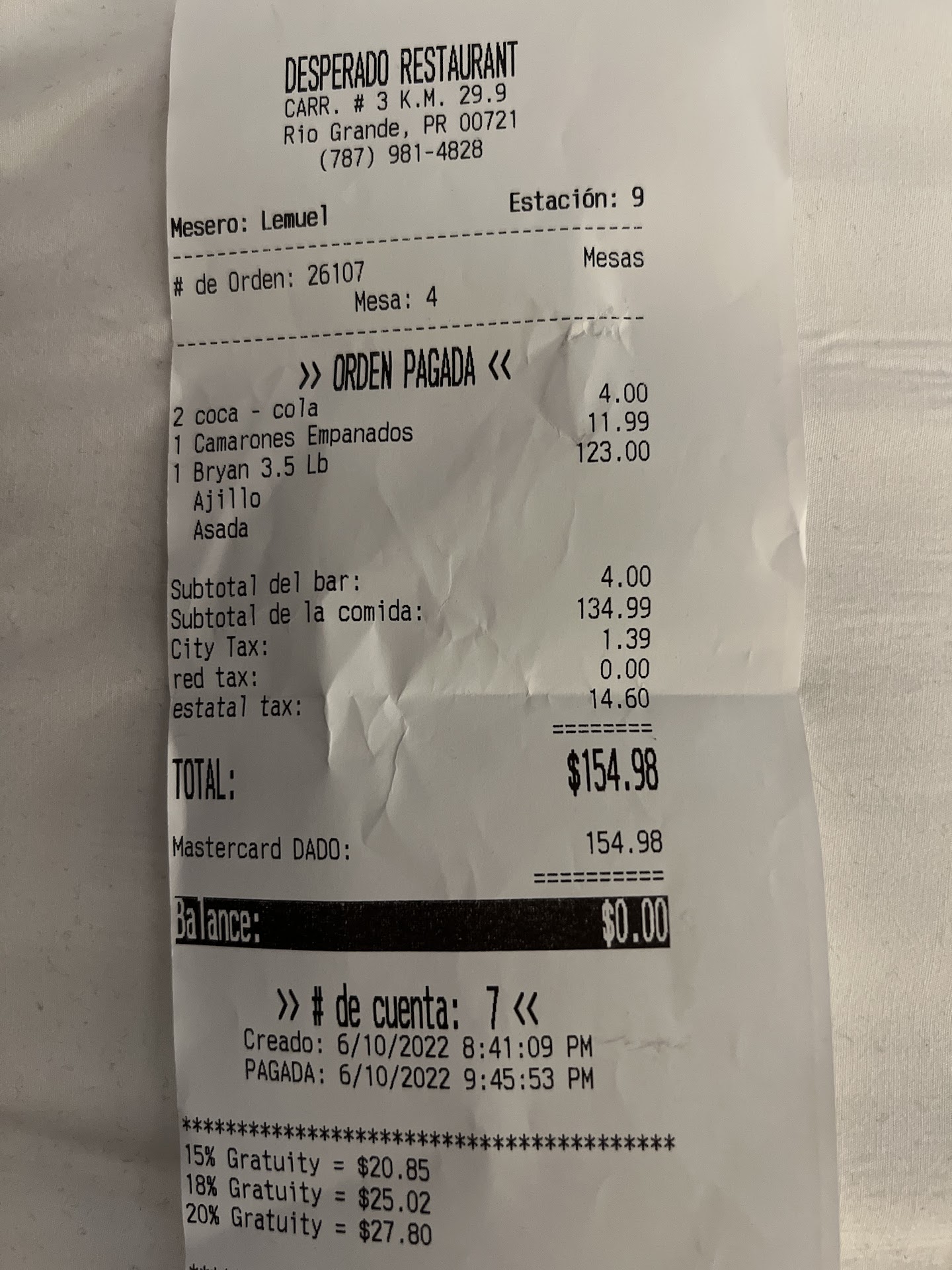 Read moreWent to Desperado on my last night in San Juan and the restaurant was empty so we thought the food & service woukd be great.