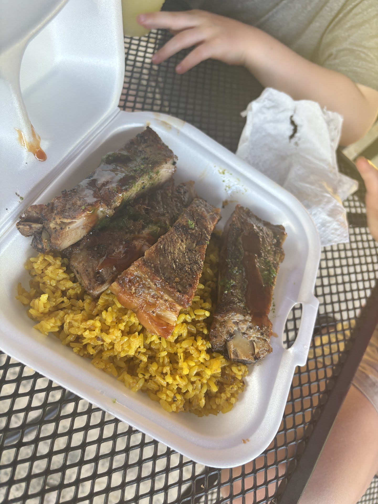 The new concept of this restaurant has only been open for ten days. We fortunately stumbled upon them accidentally and the smells from the grill convinced us to stay. It’s easy to overlook driving by, only met locals when we visited and has a small patio. All adding to the authentic experience. The local chefs are a lovely couple who are clearly passionate about the food they’re serving. Cooked over an open fire with local almond tree, guava and mango tree wood, trimmed from their own property. Nothing is fried. Homemade tamarind bbq sauce (from their own trees) is delicious, along with my favorite homemade spicy piña sauce. The chicken and ribs are luscious. The breadfruit escabeche is delicious. I can’t imagine anything is bad...