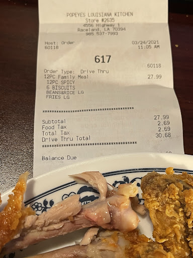 Read moreThis is not the first time I have been to Popeyes , as a matter of fact we go to pick up supper once a week .My problem is the people there give us trouble every time we go there .The y either give us the wrong dinners r they forget an item r they give us spicy chicken (can't handle the heat ) instead of mild .Now why if we get such bad service do we still go there , we'll it's the good chicken no ! the great chicken. If we had another place around us with this great chicken we would go there instead .But unfortunately we don't. So week after week we go there & wait for our order to c what we got .We park off out of the way & open up the boxes to c what we got .We don't live that close , so that we could take it back so . . . . We have taken our food home without checking it ony to have to eat what we got . Thank you very much a very...