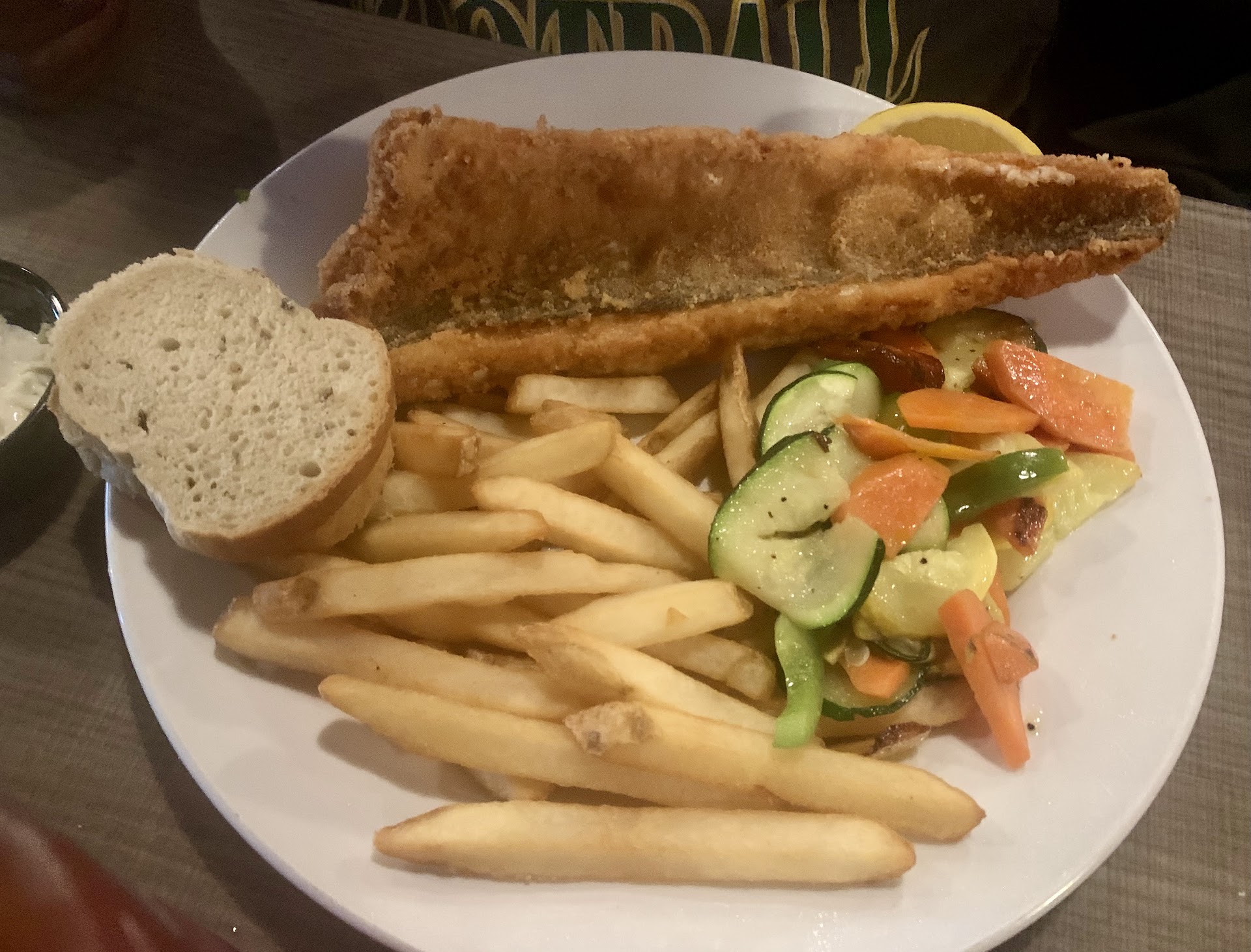 Decided to head to the water in Racine because the weather was unexpectedly beautiful and this seemed like a nice place for a fish fry. We were greeted by the most polite and welcoming gentleman as a host. He offered us our choice in booths and we were seated quickly. Although it was Friday and we tried to be understanding of the larger than most weekday crowds, we felt the food service didn’t match the warm welcome from the host. We watched other tables receive a fair amount of attention, even visits from the cooks, but we were not checked on and when we flagged someone down for refills on drinks, and a missing condiment we had requested, they offered but ultimately forgot so we went without. This service level for the price was discouraging. After dinner, we waited a very long time hoping to get a To-Go box and our bill. Our bill was quickly dropped at the table finally with an, “I’ll be right back for that”, as the server skirted off before we could ask for the box. Another member of the waitstaff noticed and went for a box. We get “busy”, trust me, but it should have been better. Maybe just an off night for our server?? Anyways- the food… it will tempt us to give the place a second chance. We each had a special that was offered with a side salad add on. The walleye was breaded lightly and the fillet was large and flavorful. The baked cod was perfect and a nice sized portion. The veggies were cut fancy, a nice variety and well cooked. The fries were crisp and hot. The side salads were delicious and colorful. Everything was a nice variety and provided a color and flavorful balance. Although disappointed by the table service on this occasion , the very kind host and the quality of food will likely convince us to give Chartroom another try- especially considering they have outdoor seating and it will be nice to have quality food, on a deck by the lake. Hopefully this can be updated to five stars in the...