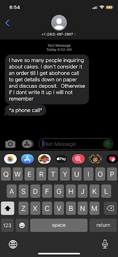 Apparently likes to delete messages and upload to her social media only parts of the conversations that make her seem like she's in the right. Well. Luckily someone screenshotted all the stuff and comments you posted BEFORE you were able to erase them. But nice try though try to get your following to believe you were innocent when you provided a wack cake for a wedding that costed hundreds and you didn't even support it properly. We seen all pictures Including what it looked like on pick up. Pick up photos you can clearly see the cake is bucking by the frosting layers... do better. This lady had a horrible attitude. update Clearly you can see upon pick up the ripples under the cake. This was a rushed job and instead of admitting it and taking responsibility she wanted to send nasty messages (yes we have all seen screenshots of all your messages) she would rather berate a customer on Facebook instead of taking accountability for her rush job of a cake.