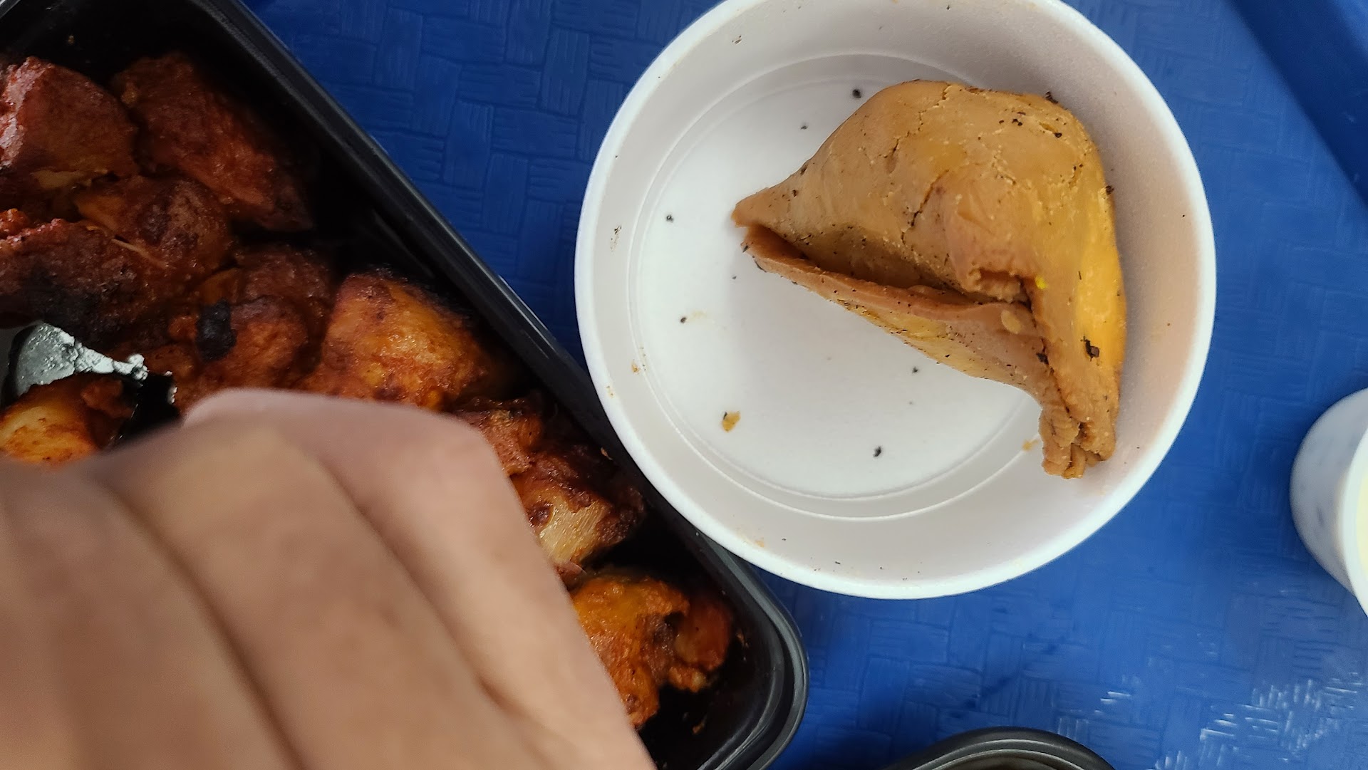 We picked up Samosa chaat, a mix of Veg & Non-veg delicacies —to-go containers served to the brim with Lots of Rice A gravy & A sabzi.