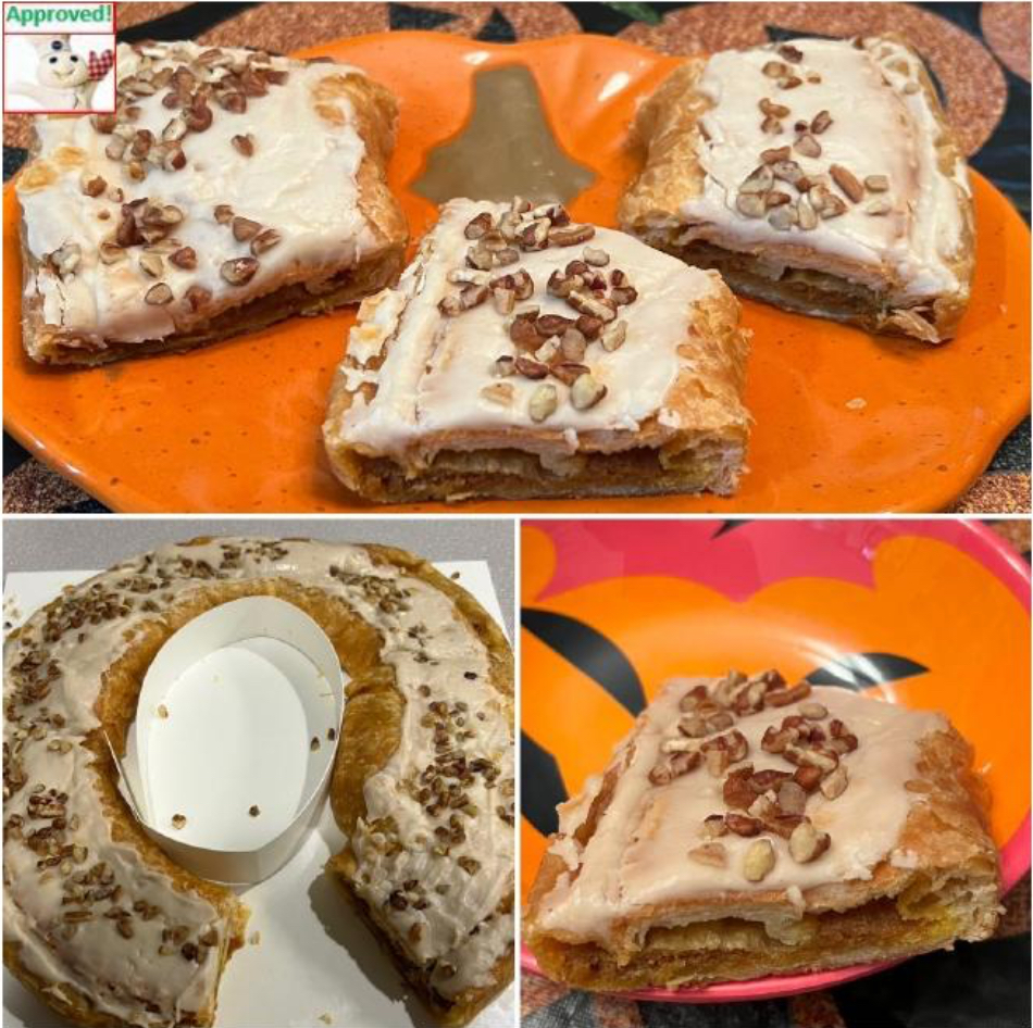 Read morePumpkin Caramel Kringle: A Kringle is a large circular Danish pastry with flaky dough, covered in icing, & filled with fruit, nut, or other more unique flavors. After doing a little research I’ve learned that sadly, Kringles are not widely spread throughout the U.S. It turns out that Racine, WI is actually the epicenter for Kringles. O&H Danish Bakery opened in 1949 and has been family owned for four generations. Did you know Kringle is the official state pastry of Wisconsin? This one is filled with a sweet and delicious pumpkin puree and topped with a drizzle of caramel icing and sprinkling of pecans. The pastry has just the right amount of chewiness to it and is also a little flaky like a croissant. O&H does not skimp on the filling as there is plenty of pumpkin hiding inside. Personally, I found pumpkin was the strongest flavor, but it's accompanied by cinnamon and a nuttiness (from the pecans). Caramel was the least noticeable as it came off as mostly a generic sweetness on my tastebuds. Personally, I don't care for nuts on my desserts, so I would be fine if it didn't come with pecans. Although I would have liked more caramel and less pecans, pumpkin is the most important factor, and this was a phenomenal pumpkin dessert! Doughboy...