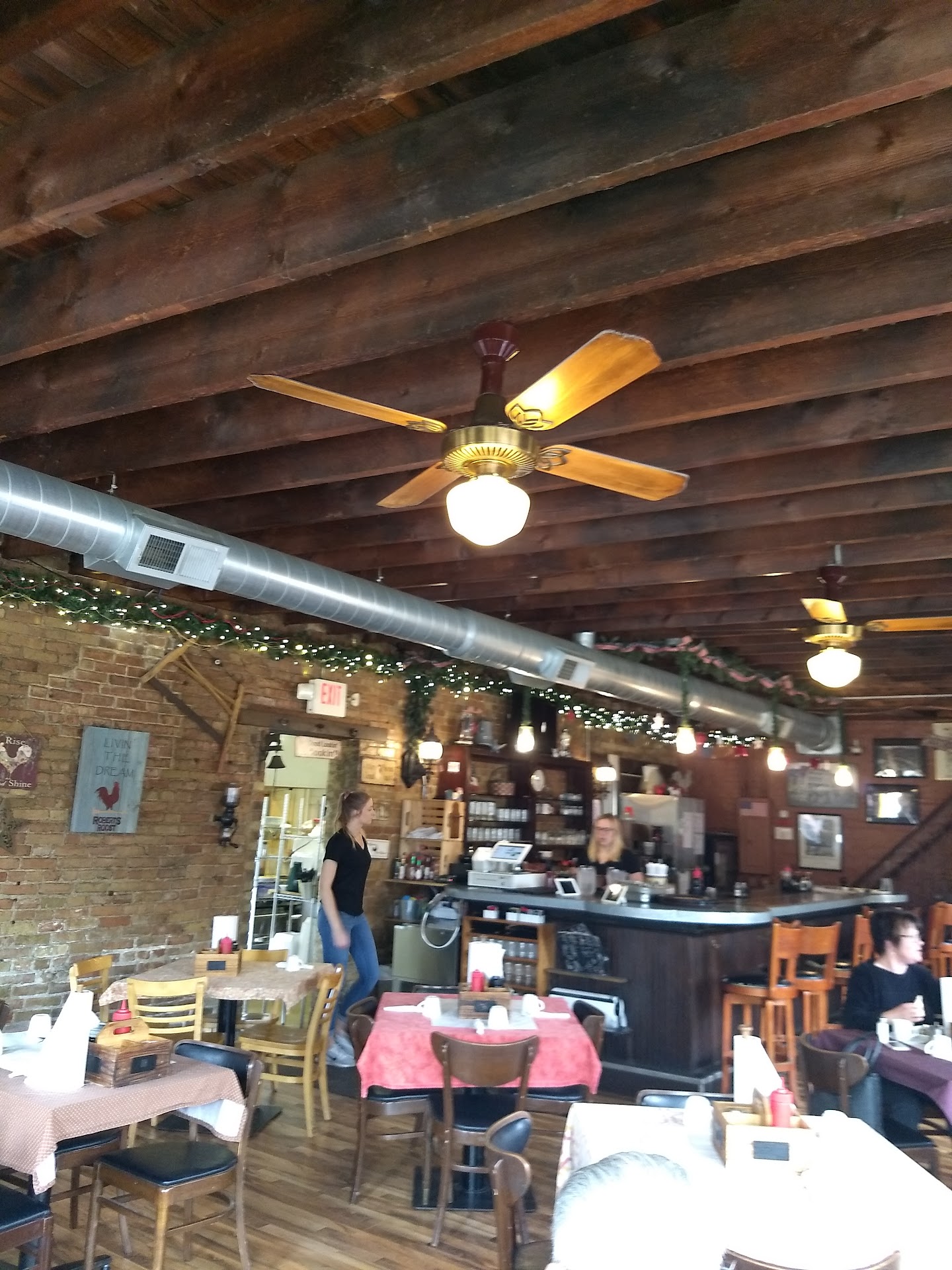 Read moreI ranked this 2 🌟 because of the condition of the facility. This is a 1970's era drive-thru restaurant turned into a family breakfast and lunch restaurant. The current owners have improved the food and service keeping the same menu from the previous owner. However I cannot see that the current owners have done anything to improve the property. The parking lot is aging, lines are nearly invisible. Handicap parking is available on the Northside of the building but the entrance is not wheelchair accessible. The restrooms are cleaner, but small and again not wheelchair accessible. The restrooms seemed like an afterthought when built. To access them one must walk through an a partial exit and navigate through an opening that is not as wide as the restrooms. A wheelchair is making 2 "S" turns to get into the restrooms. And, once winter sets in the restrooms are freezing cold. The decor of the interior of the restaurant reminds me of "That 70's Show". While I don't totally avoid Roosters, it definitely is my last...