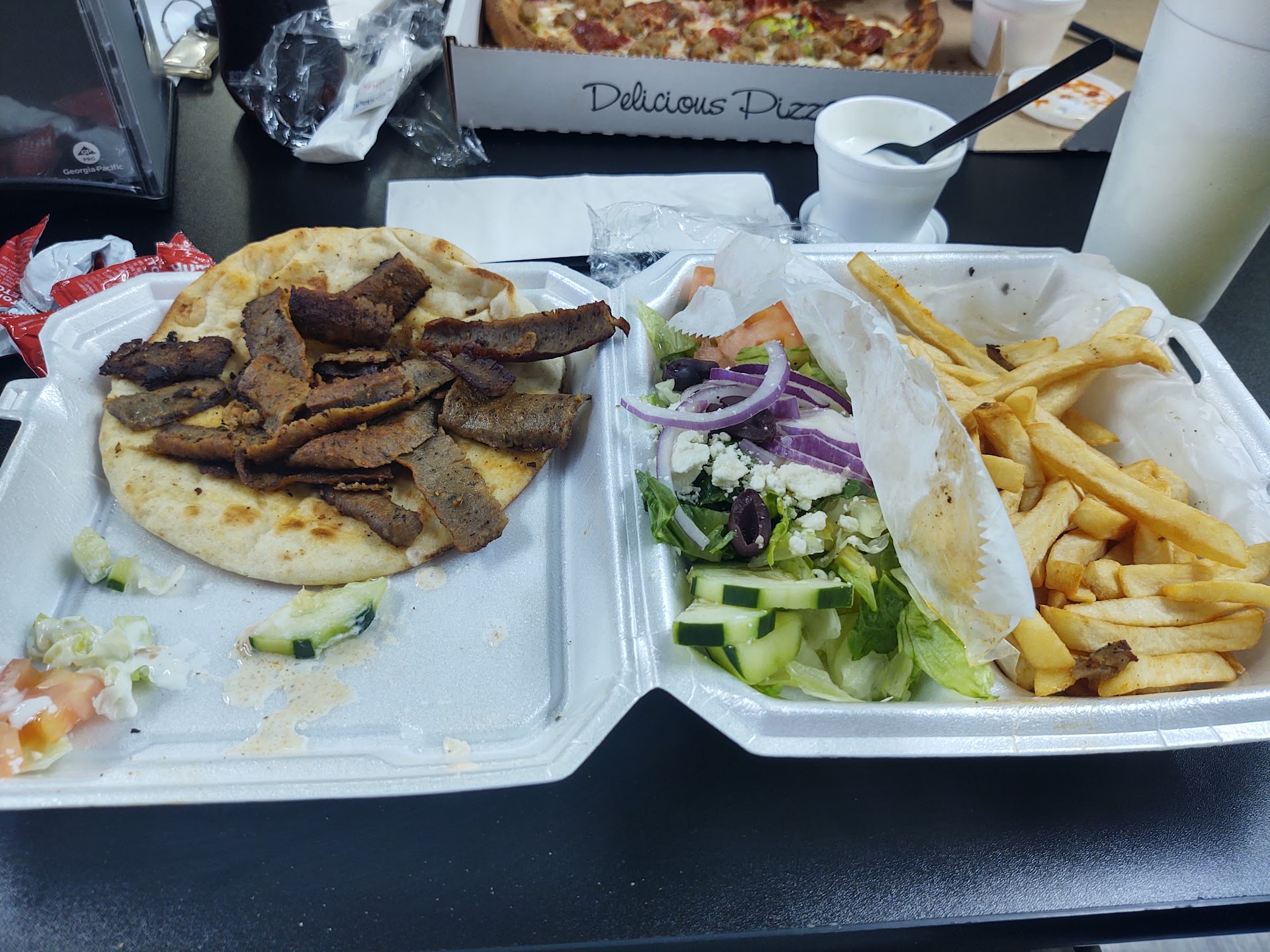 Read moreWasn't sure what to expect when we stopped in. they had been recommended by folks from here I'm working with. They have a huge menu which in my experience usually means average at best on the food. it's one of those, walk up to the counter to order kind of places. I ordered the lamb gyro plate with fries. I was surprised by the amount of food I got. A huge pile of fries, a ton of vegetables for my wraps, two good size flatbread, and a PILE of meat in between. Easily enough for two people, or enough to take some home. the lamb had a great flavor, and definitely wasn't like a chain, with the preformed pieces of meat. Others in my party got pizza, spaghetti or other pasta. it all looked good. All in all, I think it's pretty good place. At least mine was. the service was very friendly as well. Prices were pretty good for the amount of food. it's worth checking out. I'll be back in there if business brings me back to town. (picture below was after eating one of my wraps...