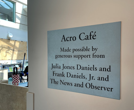 The Acro Cafe was a welcome and FIVE STAR stop following our lengthy and enjoyable tour of the North Carolina Museum of Natural Sciences in downtown Raleigh (with toddler). Located on the top floor of the museum and next to the butterfly house and garden, we welcomed the tables and chairs, Larry's coffee, cookies, water, and cake pops. A more extensive menu is available, but we ate lunch at the beginning of our multiple hour tour at The Daily Planet (also FIVE STARS) adjacent to the museum. Interesting note: The Acro Cafe is made possible by a grant from the late Julia and Frank Daniels and The News...