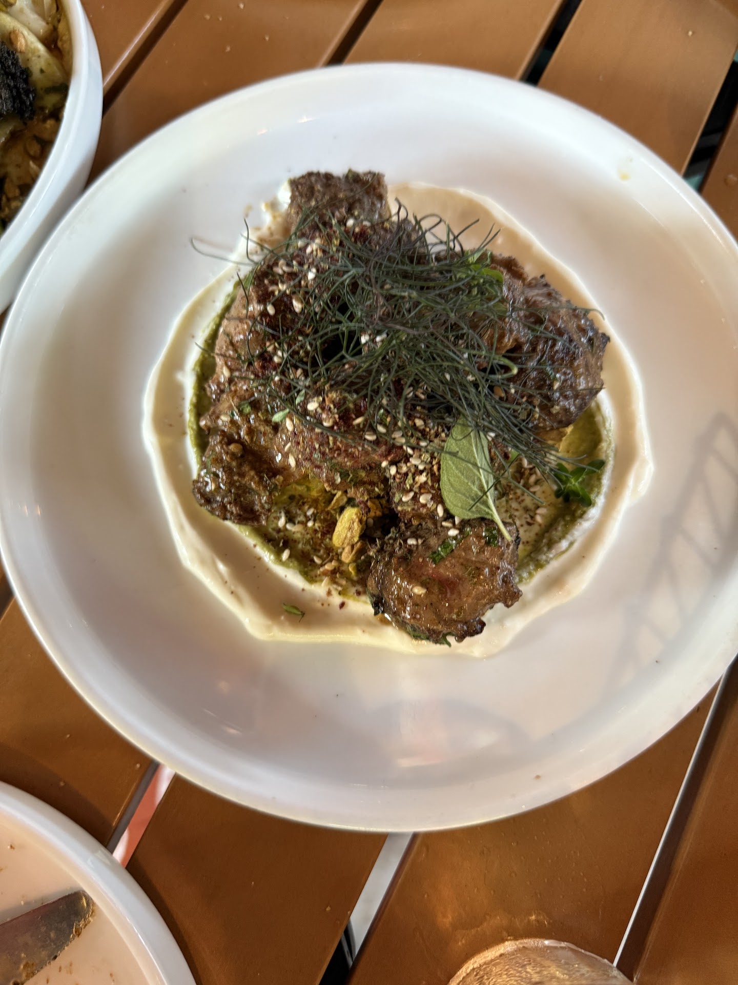 lamb seekh: saw this on many reviews. Very tender but did get some questionably chewy bits. The flavor was very good though. The accoutrements however: labneh, sweet pea chermoula, pistachio - I could have eaten by the spoonful (7/10)