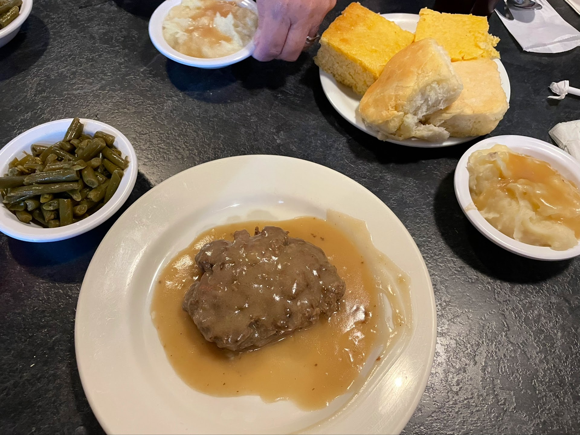 I went to Big Ed’s North located at the corner of Millbrook and Falls if Neuse for lunch Aug 16, 2023. It was my first time eating there. It states it’s a country diner and that it is. Good home cooking. Reasonable prices. Nice diner atmosphere. Very clean. I did not use the facilities so I can’t comment on that. I ordered the hamburger steak with mashed potatoes and gravy, green beans, corn bread, peach cobbler (inc in the lunch price 🤤) and sweet tea to drink. The cost was $15 for all of that. The meal was delicious. The hamburger steak was cooked perfectly and not dried out. The mashed potatoes were not instant potatoes which is always a plus with me. Nothing like homemade mashed potatoes with gravy. The green beans were southern good, not crunchy, and the peach cobbler was cooked to perfection. I felt it had a great ratio of peaches to cobbler. I love sweet tea. What southern girl doesn’t love sweet tea? I thought the tea was a little heavy with sugar. It had a thicker consistency. Tea flavor was very good-not weak. Just a tad bit syrupy, but still good. We had to wait 10 min for a table, which isn’t long at all. If you prefer not to wait you can skip the line and check out the bar in the other room. If seats are available take a seat and enjoy your lunch! If not, just get back in line and wait for a table. Payment is not taken at the table. There is a cashier at the exit door. One final note-breakfast is served all day, everyday. I will definitely be going back to Big Ed’s North!