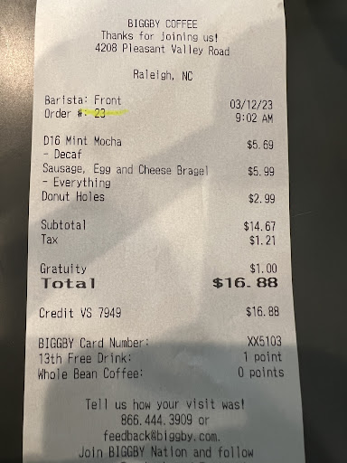 Read moreI needed to get some work done, wasn't able to do that at home, and I have been meaning to try the newish Biggby coffee location near me and thought I would give it a whirl. I've had friends on the other side of Raleigh say that their Biggby's is great for working. Online it said cozy atmosphere, and that it was quiet around the time I was going, so it seemed perfect.