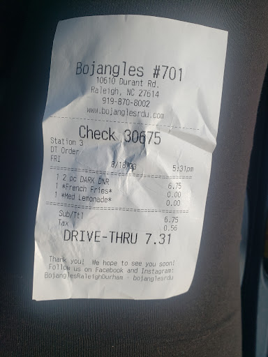Everytime I make the mistake of going to this bojangles I am reminded why I prefer driving to the one on capital instead. 9 times out of 10 the order I receive isn’t correct. Once they gave someone my order and we had to wait 40 minutes to get our order. Which they did rectify that situation nicely and gave us 2 free meal vouchers. But again tonight I pull into the drive thru, order what I want and repeat myself once (which is fine I understand it might be hard to hear). But when they took my order they didn’t ask what drink I wanted in the combo and automatically put me down for tea. So I thought that’s okay I’ll just ask them to change it at the window. I get to the window, the exchange is nice, I give the cashier my money and so forth. But as soon as they hand me the drink and I ask for it to be changed, it’s like all the customer service “niceness” evaporated. “You want to change the drink even though this one is already made?” Yes I didn’t order that drink, I wasn’t even asked what drink I want and I don’t even like tea. Luckily I like their fries even if they’re barely seasoned half the time (because I didn’t get a choice in that either). But jeezus, couldn’t even offer a fake half smile or your welcome as I thanked them twice for getting me a new drink and for handing me my food. I get it was 9pm and you close in an hour and maybe your gassed from your shift but it’s not that hard to at least pretend to have good customer service. I work retail myself, maybe not fast food, but I have to fake my customer service niceness all the time it’s not that hard. Finally done with this place rather drive to the one on capital and get my order...